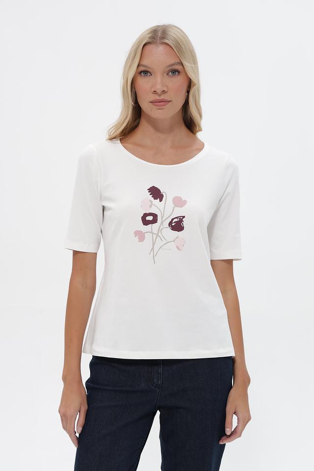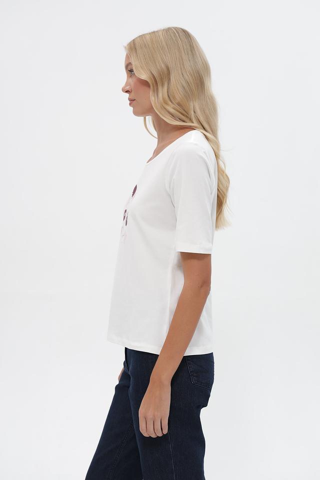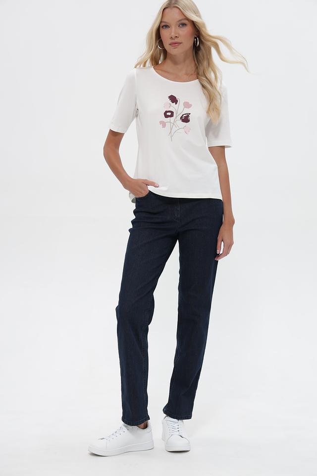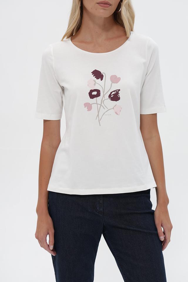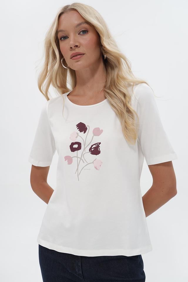 Белая футболка Tom Tailor с цветочным принтом, выполненная из мягкого хлопка с добавлением эластана. Модель имеет округлый вырез горловины и короткие рукава, обеспечивающие комфорт в жаркую погоду. Состав: 95% хлопок, 5% эластан. Состав: хлопок 95%, эластан 5%