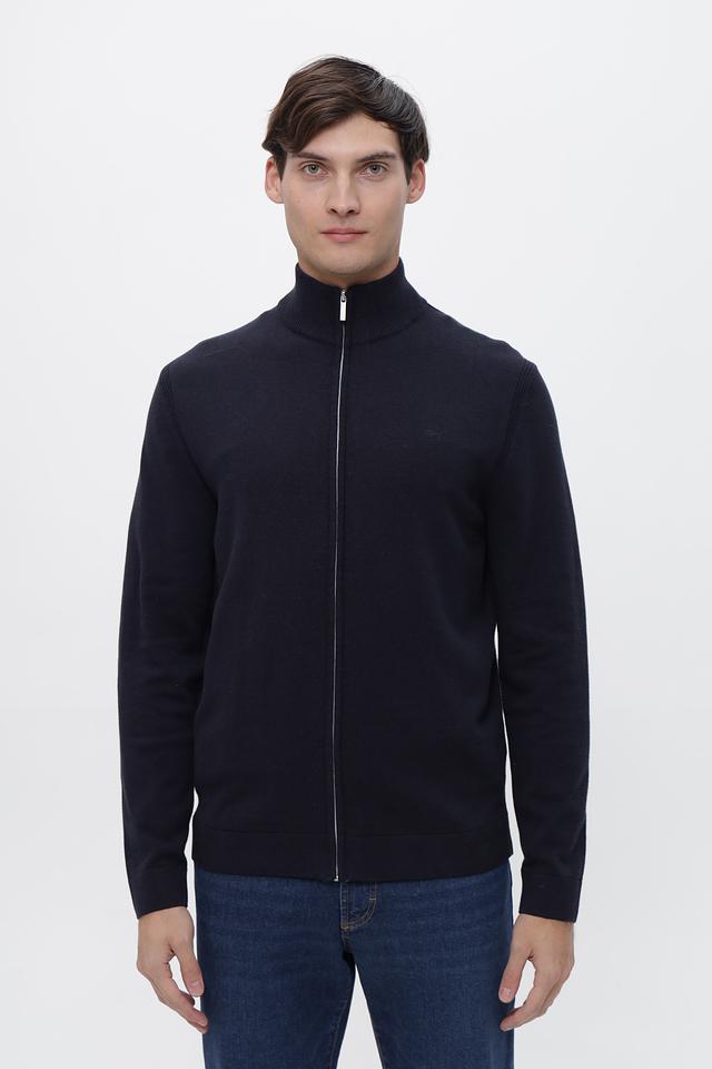 Кардиган имеет классический крой с застёжкой на молнию, что позволяет легко регулировать степень тепла. Тёмно-синий цвет делает его универсальным элементом гардероба, который легко сочетается с различными стилями одежды.