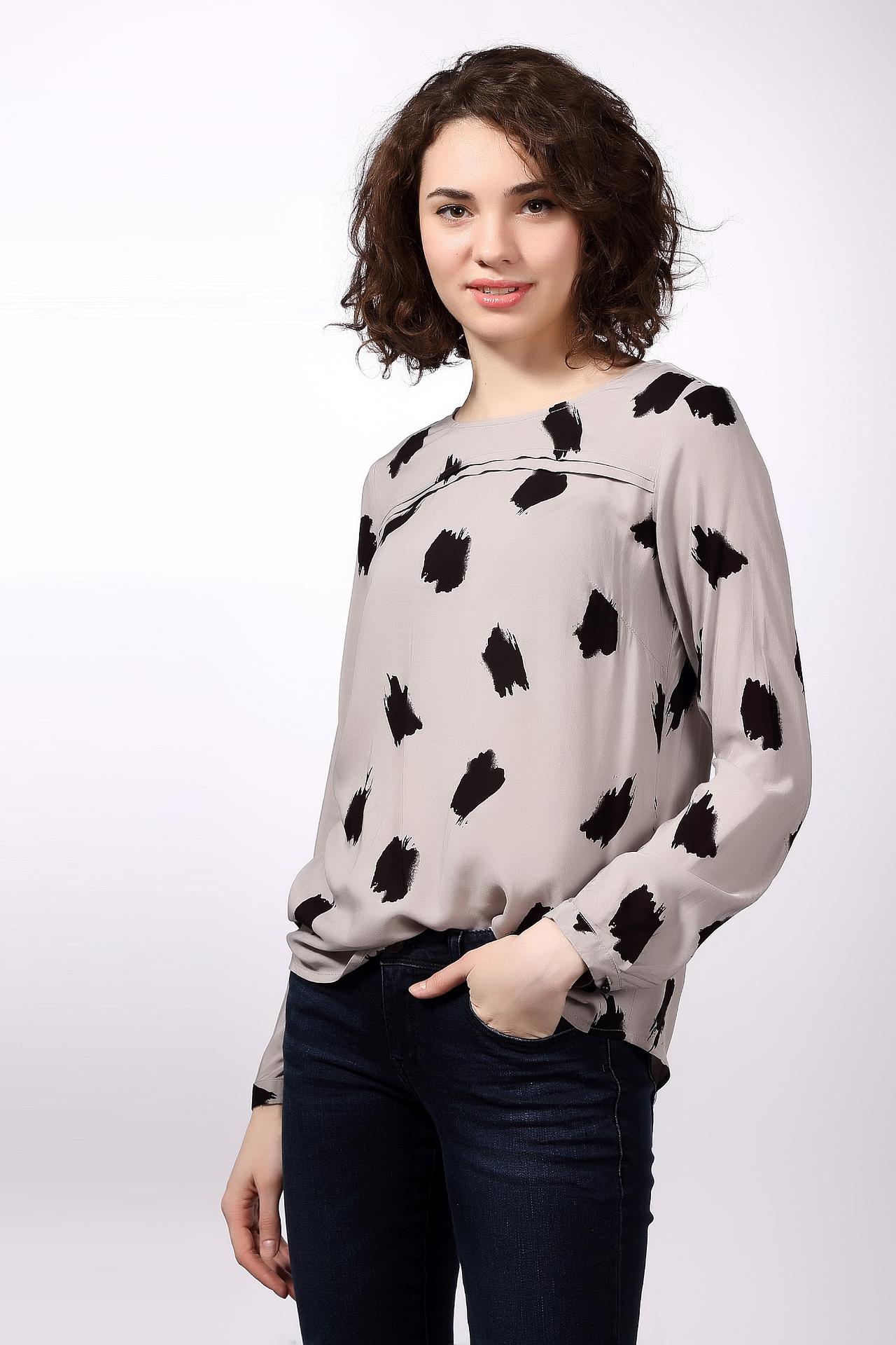 Стильная женская блуза бренда Tom Tailor. Это блуза светло-серого цвета, с пятнами черного цвета. У данной модели круглый вырез, длинный рукав, а на спине она застегивается на пуговицу. Материал - 100% вискоза.