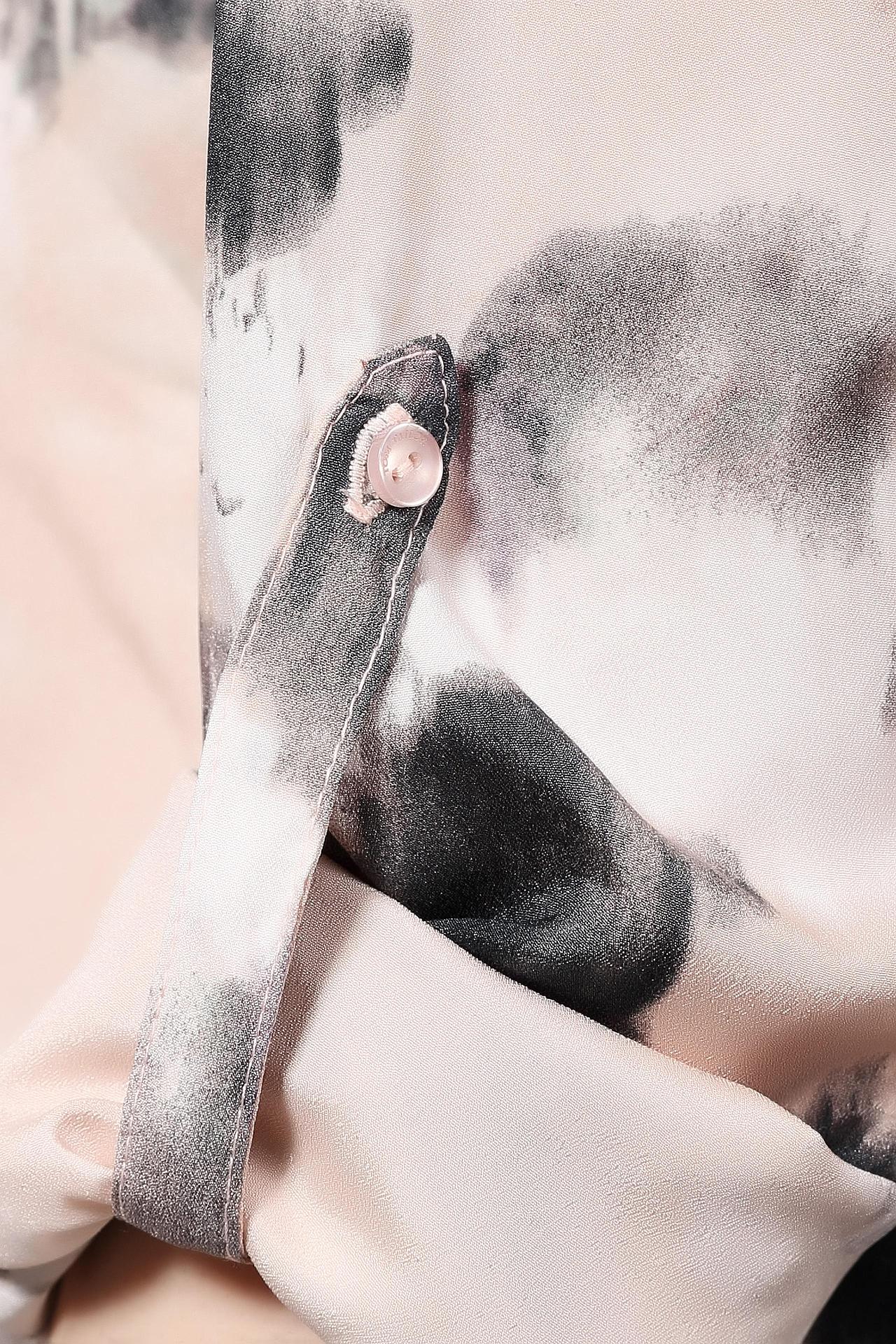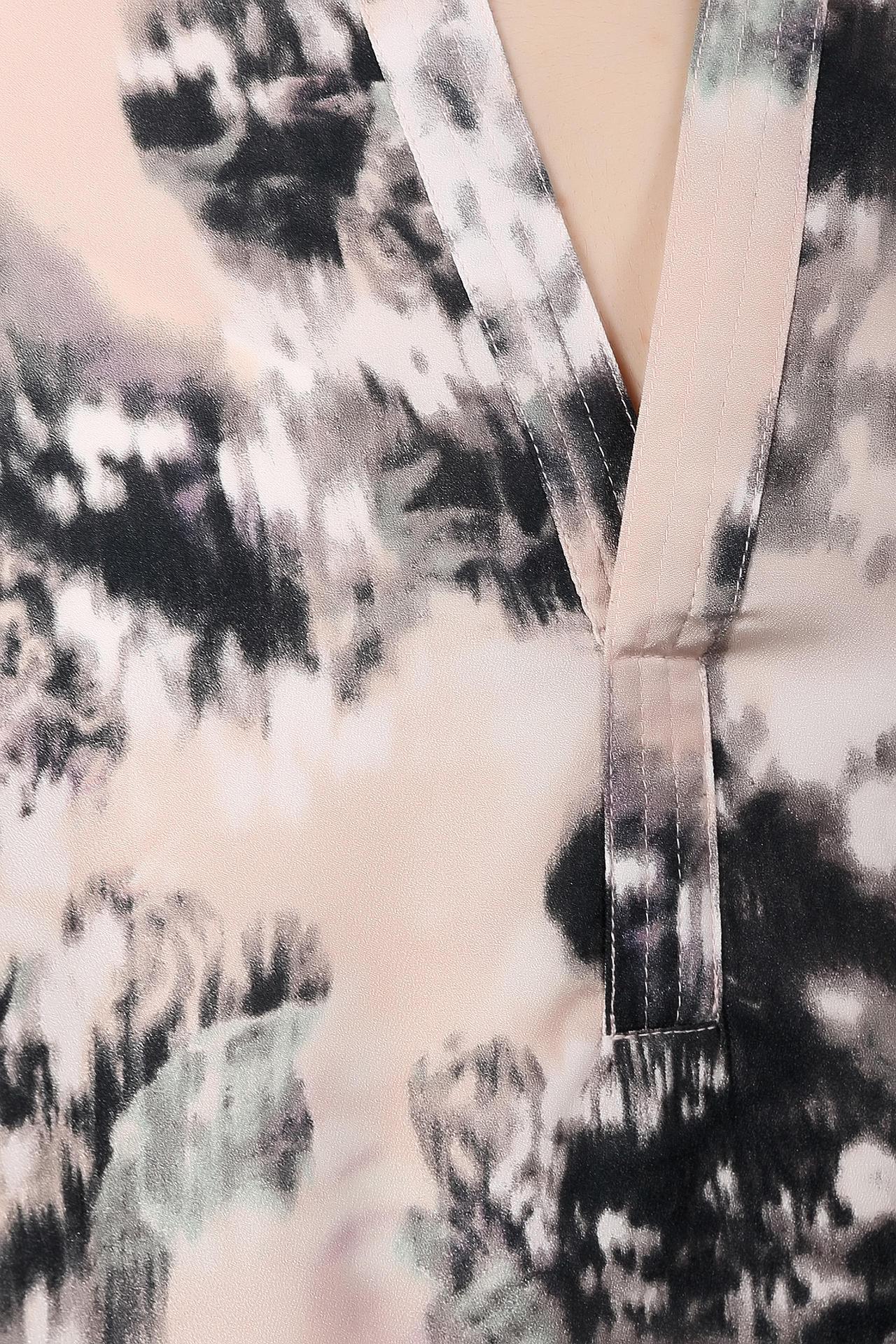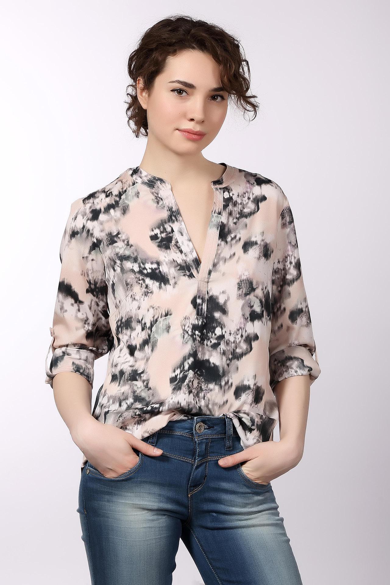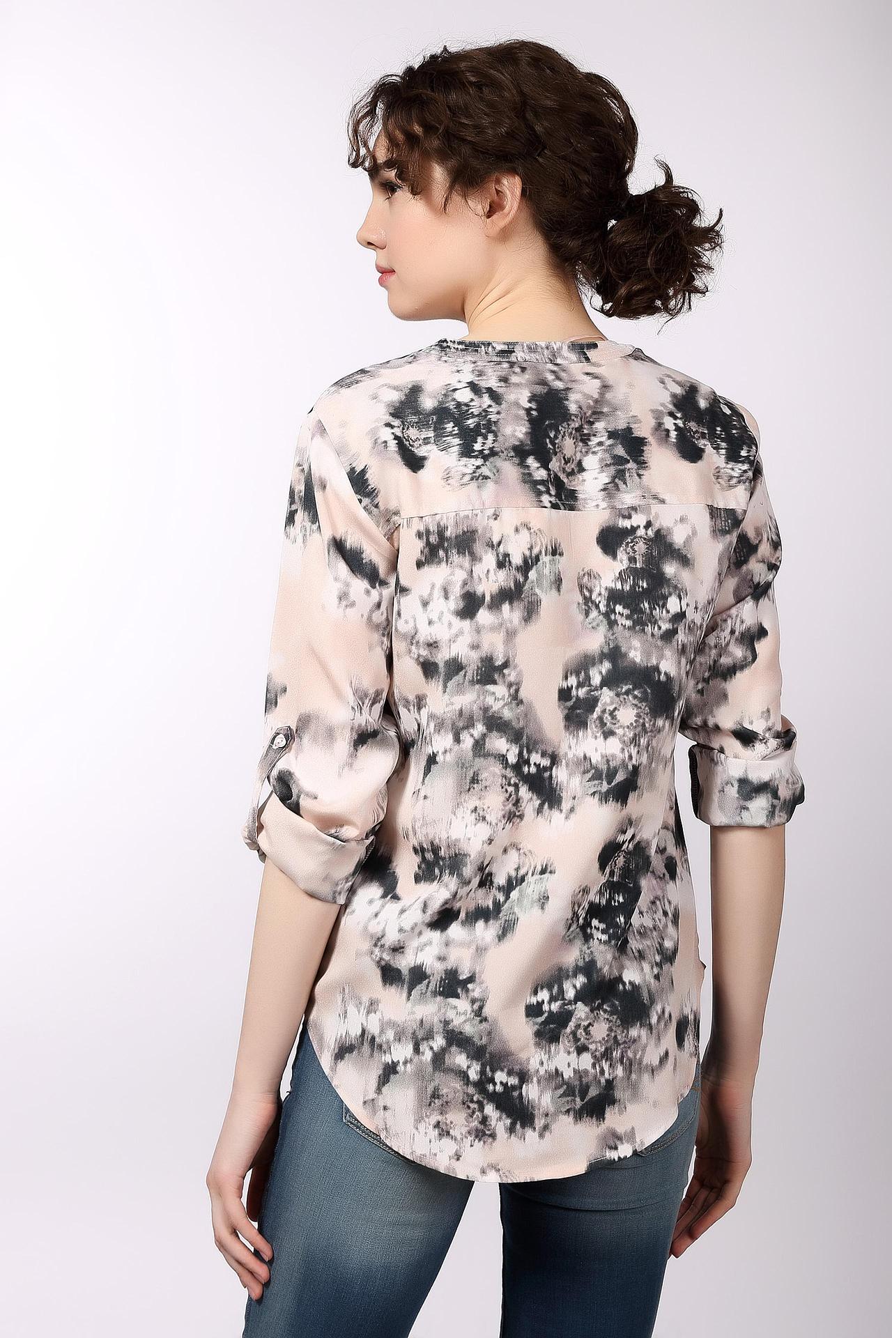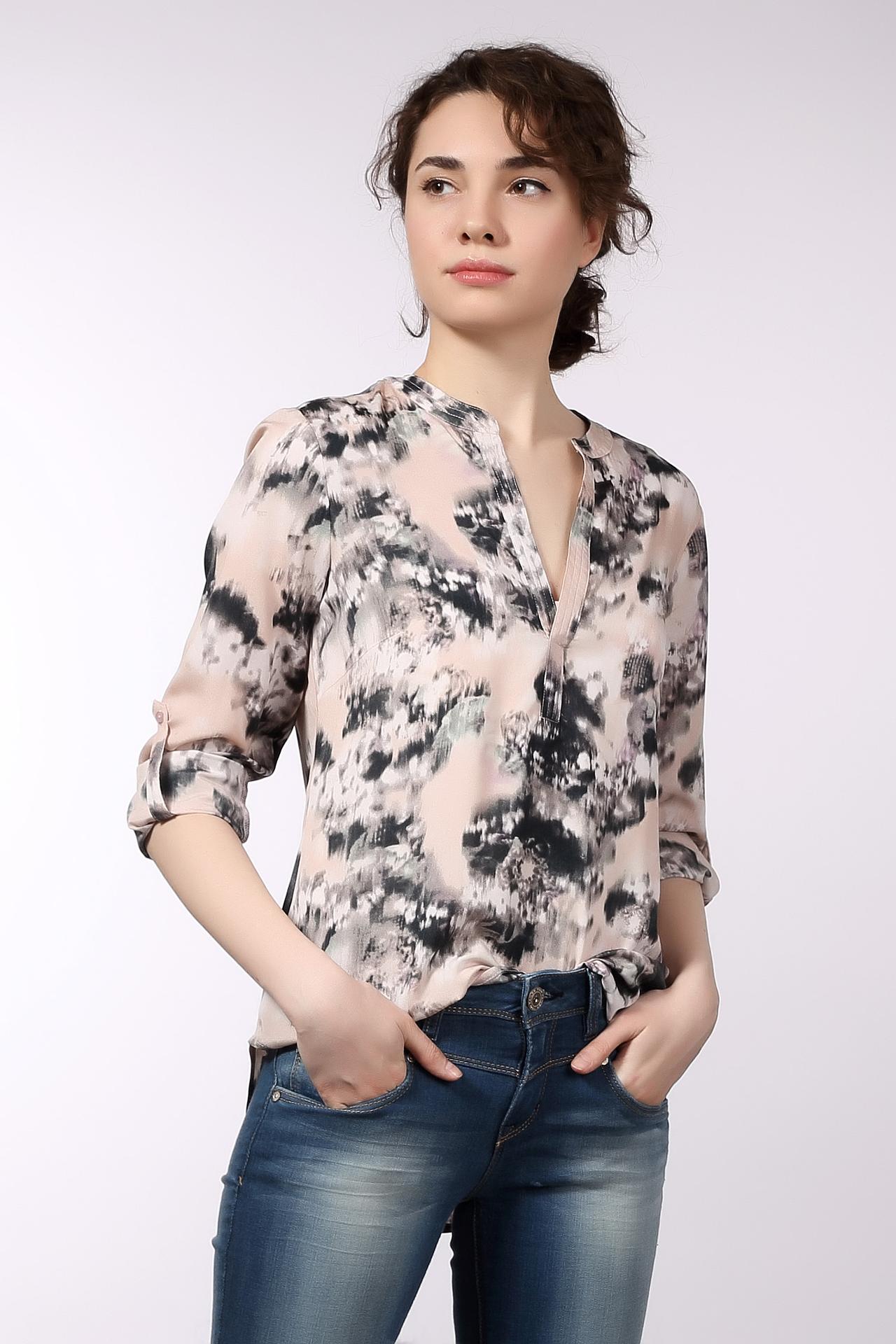 Необычная женская блуза от бренда Tom Tailor. Это блуза бежевого цвета, с оригинальным принтом черно-белого цвета. Изделие дополнено: v-образным вырезом, удлиненной спинкой и длинными рукавами с возможностью отворота. Материал - 100% полиэстер.