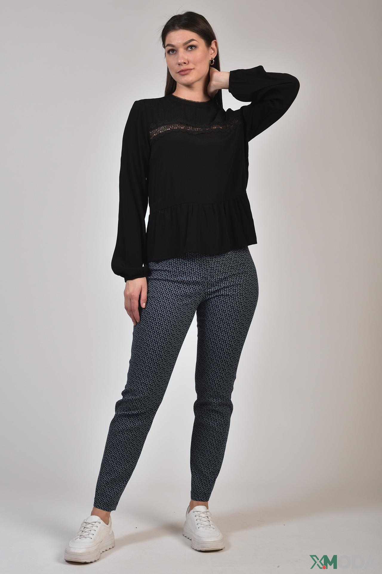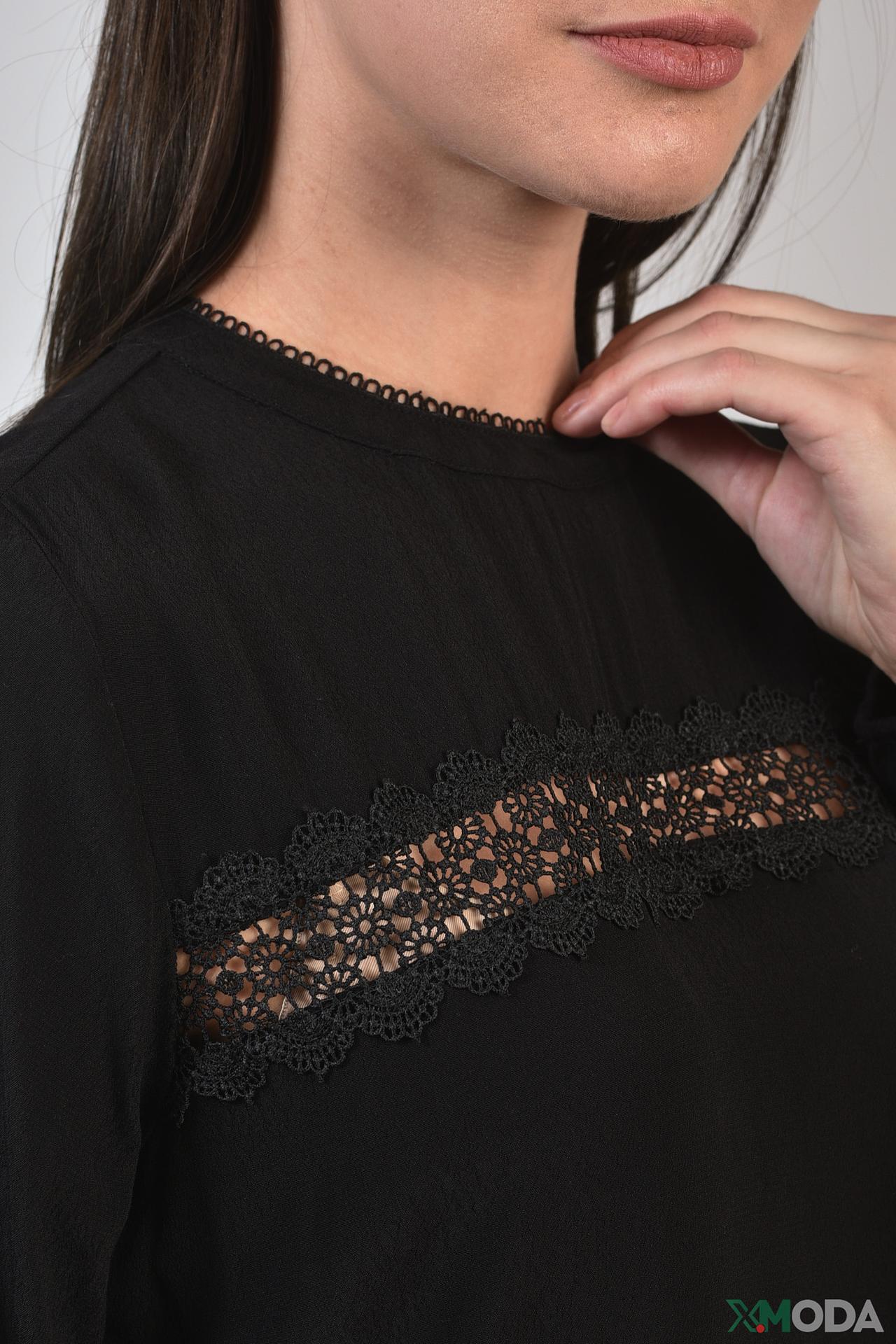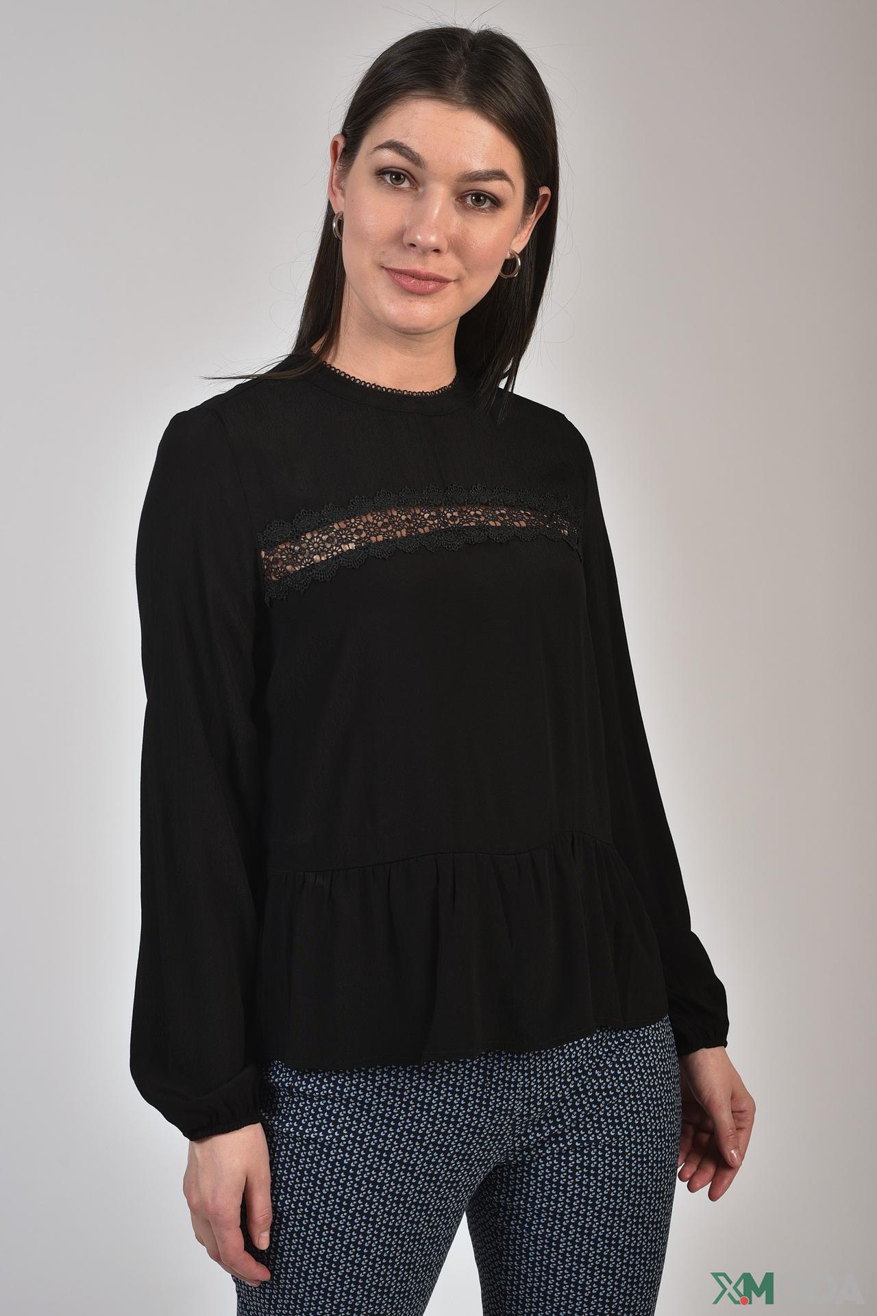 - Дизайн: Классический крой с длинными рукавами и круглым вырезом дополнен декоративной кружевной вставкой на груди и воланом по нижнему краю. Такая блузка подходит для создания как повседневных, так и более нарядных образов.