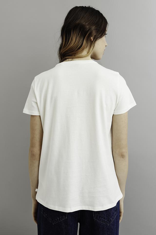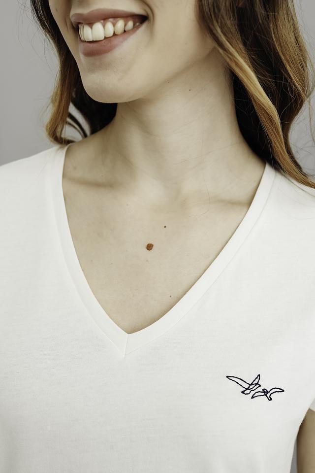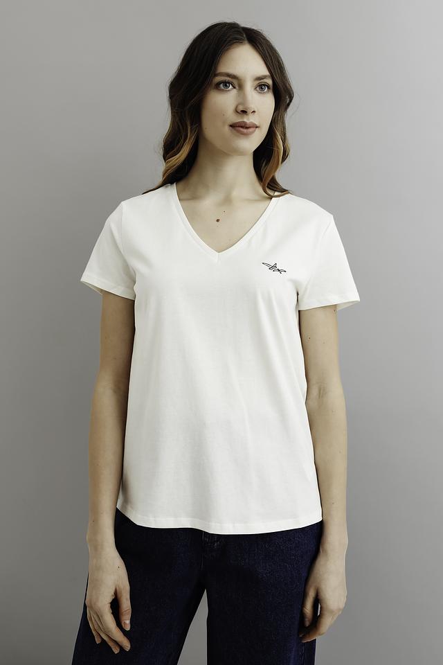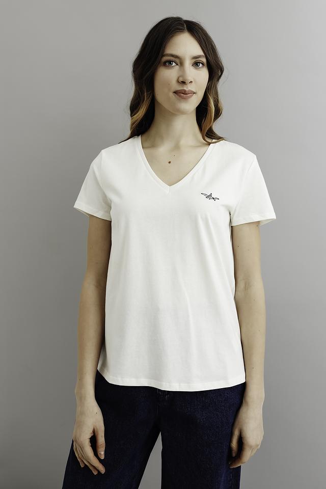 Футболка имеет классический крой с V-образным вырезом, который подчеркивает женственность силуэта. Короткие рукава делают ее идеальным выбором для теплой погоды.