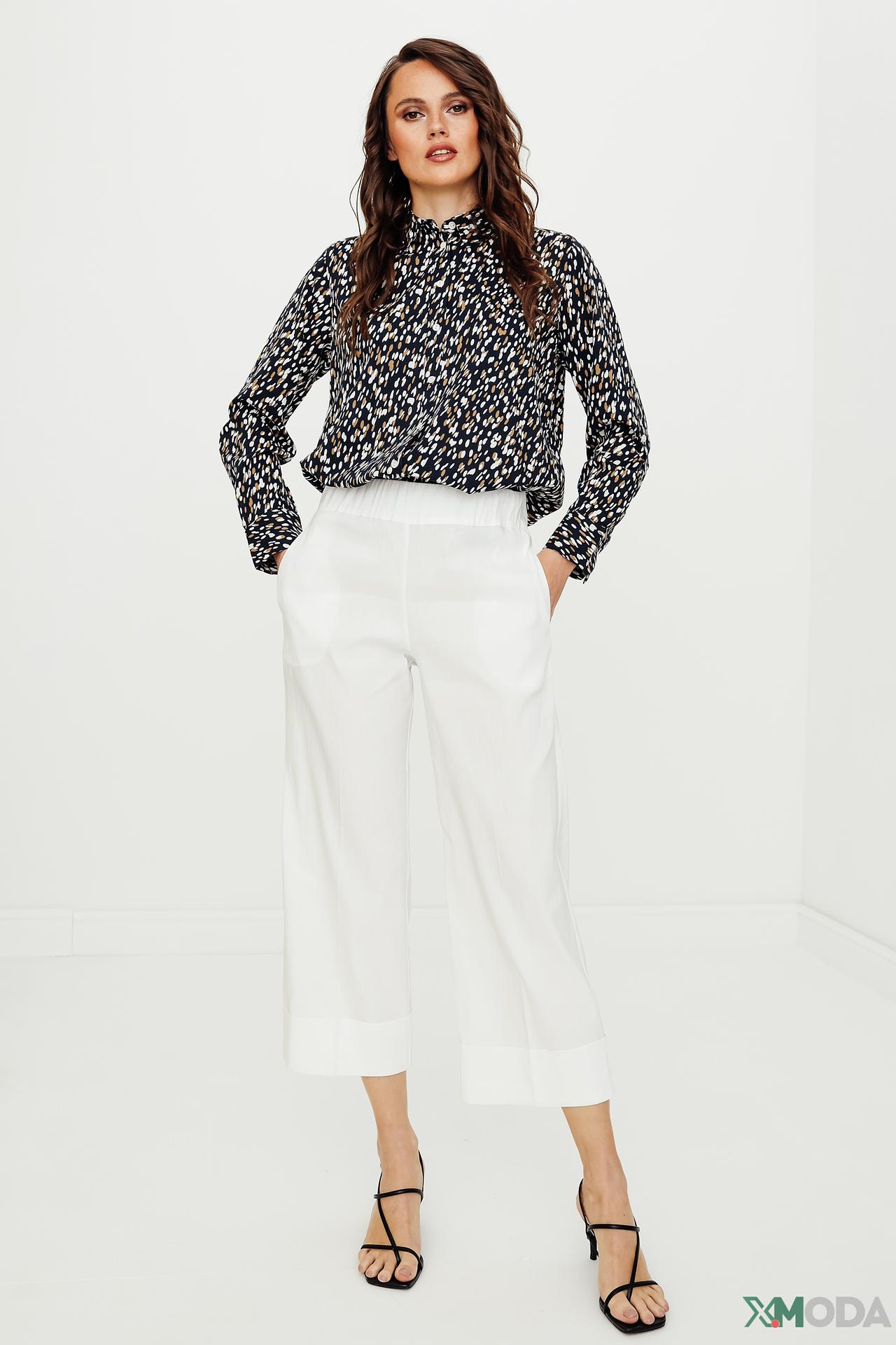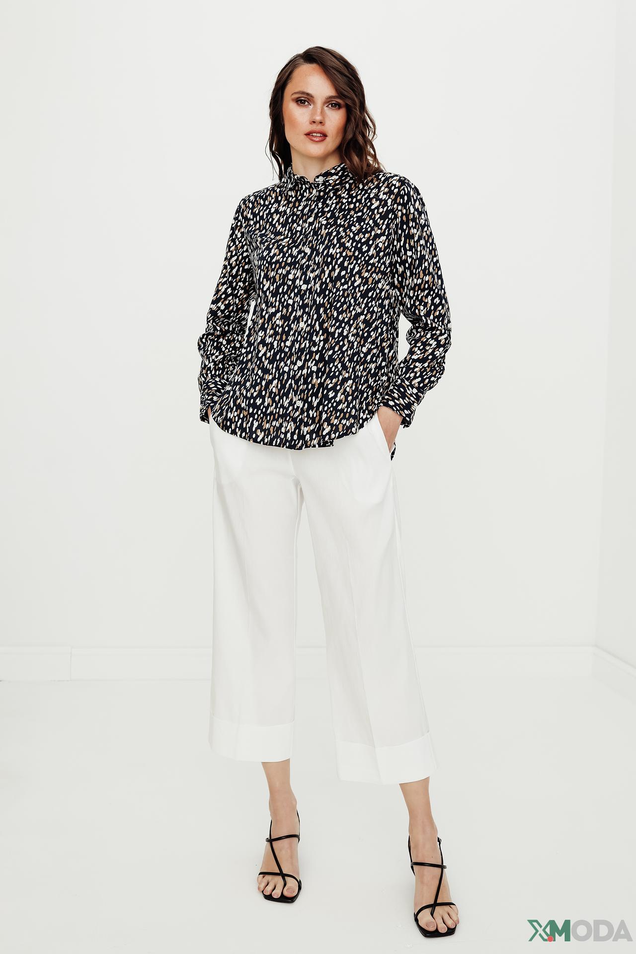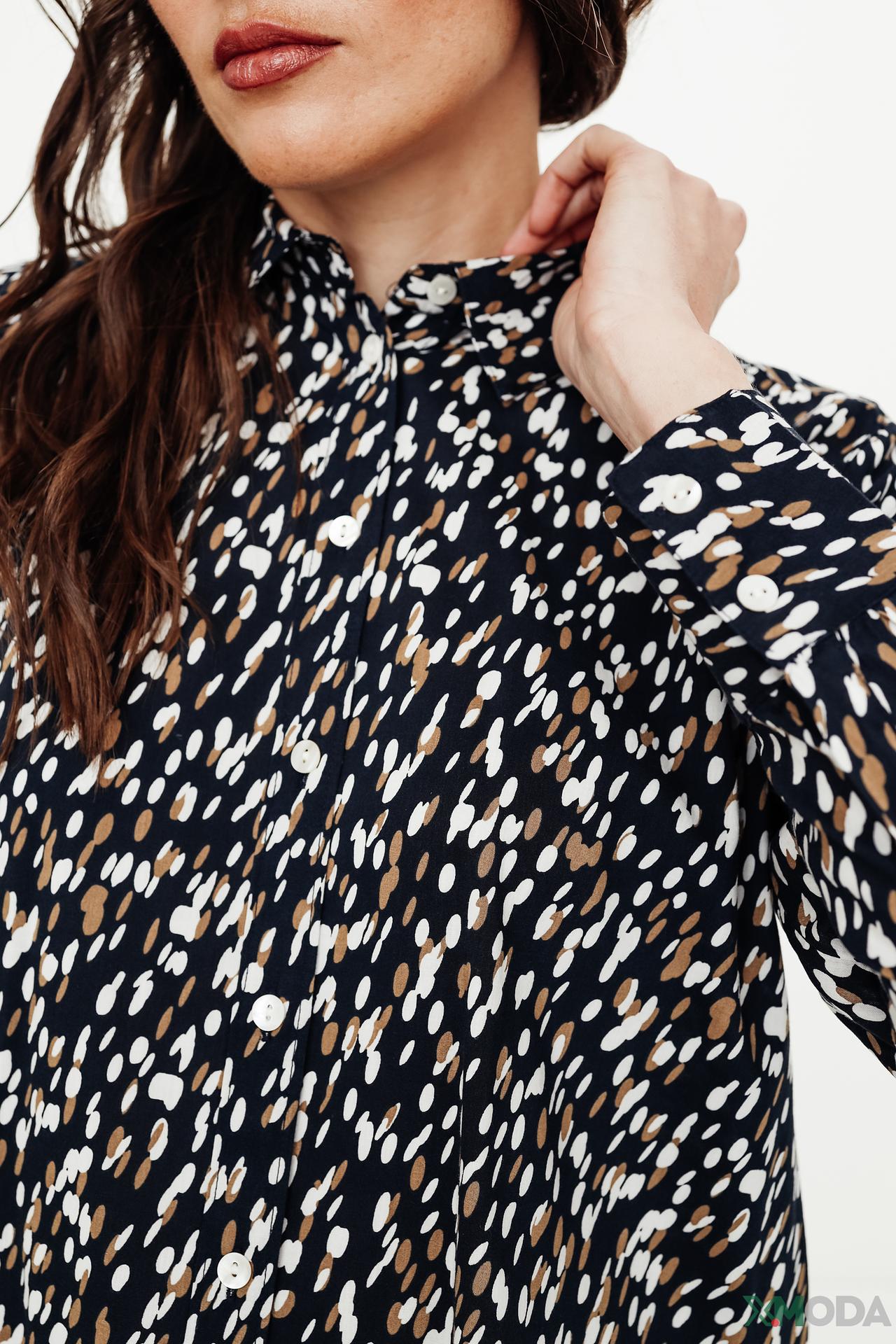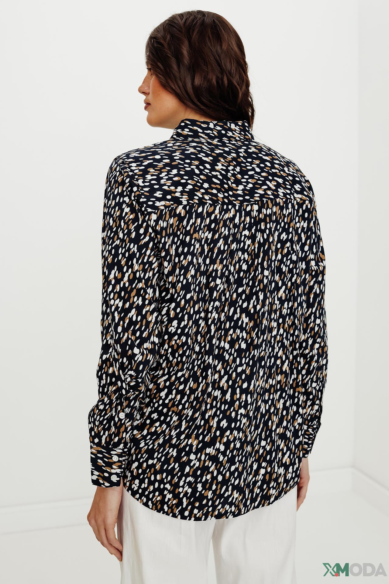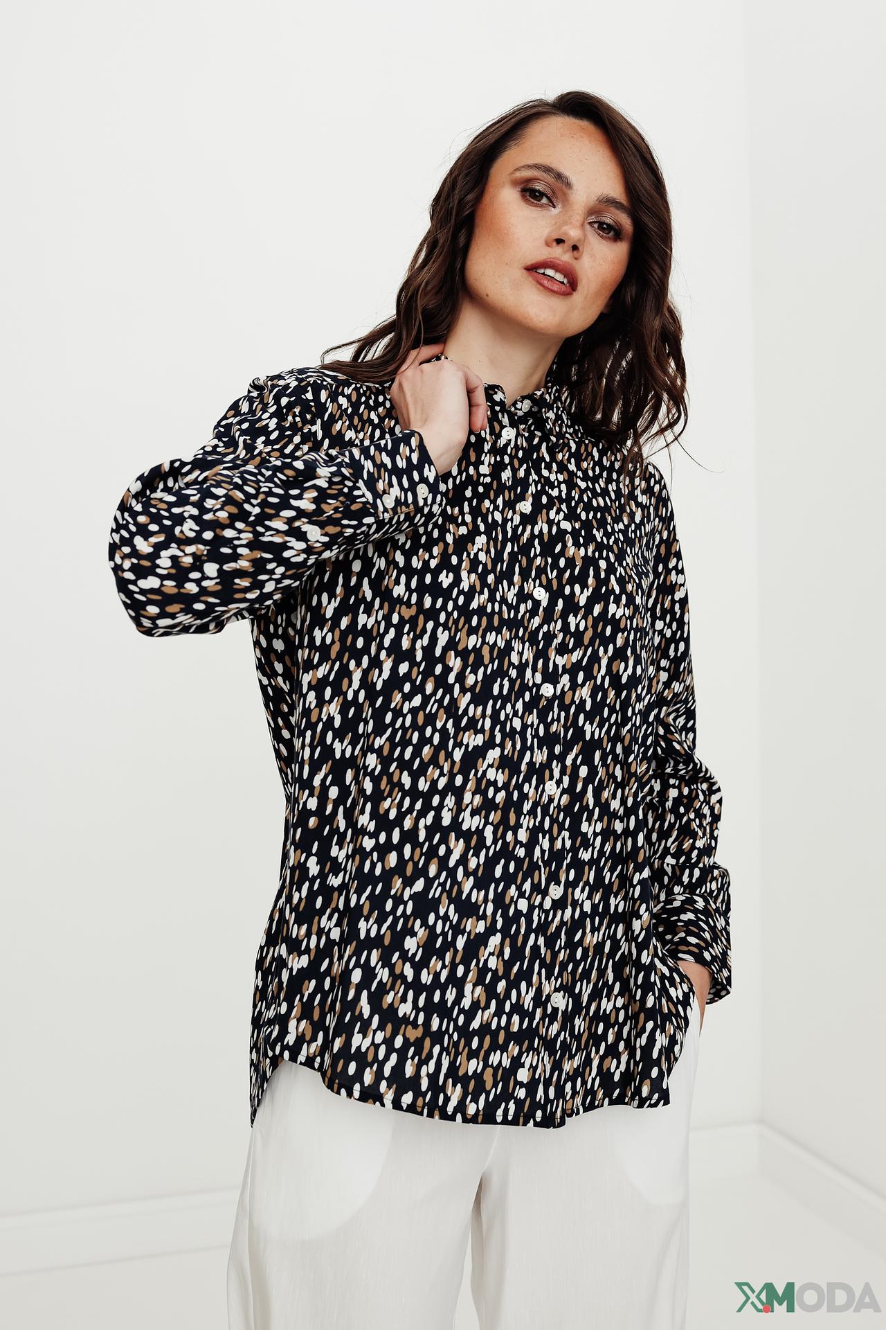 - Дизайн: Классический крой рубашки с длинным рукавом дополнена стильным воротником-стойкой с завязками, что придает модели женственности и утонченности. Оригинальный принт делает эту рубашку особенно привлекательной.