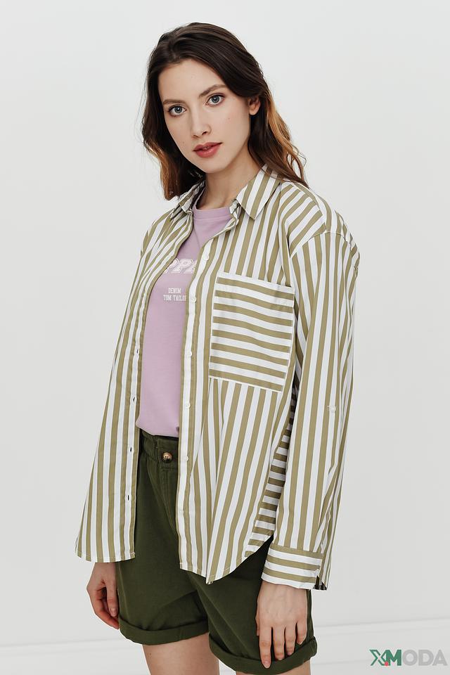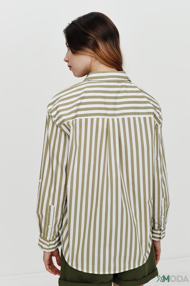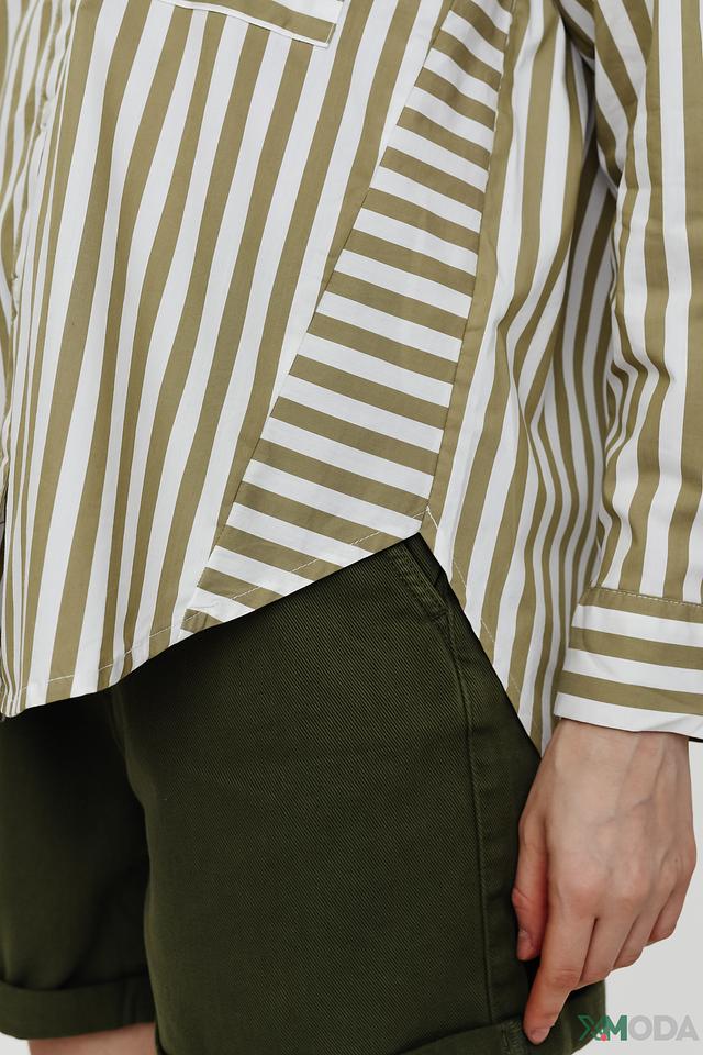 Основной цвет рубашки – сочетание зелёного и белого в вертикальную полоску. На груди расположена накладная деталь в полоску, добавляющая оригинальности дизайну. Рубашка застегивается на пуговицы.