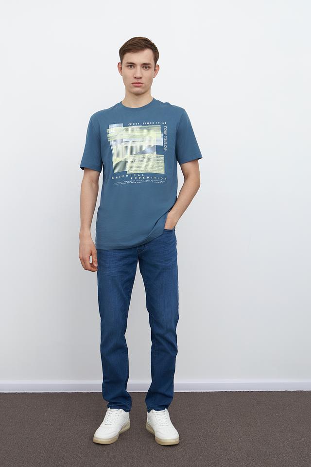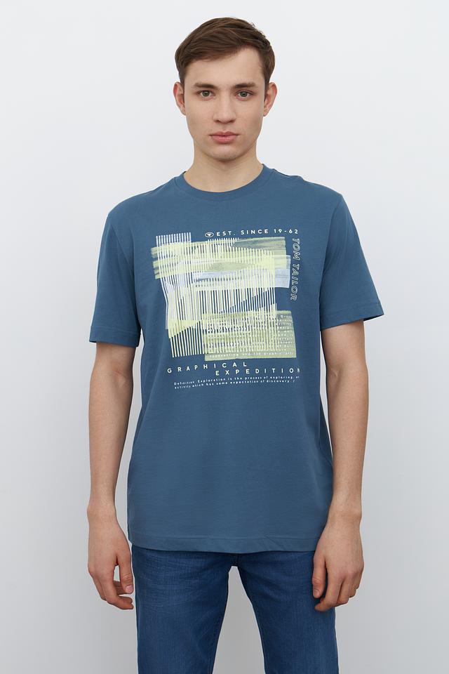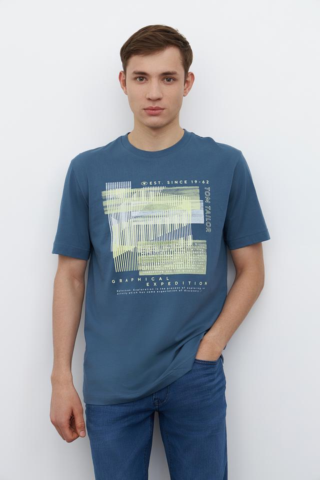 Мужская футболка Tom Tailor синего цвета с оригинальным графичным принтом. Изготовлена из 100% хлопка, обеспечивающего комфорт и воздухопроницаемость. Состав: хлопок 100%
