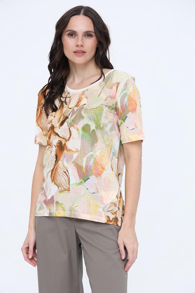 Женская футболка Toni collection бежевого цвета с ярким цветочным принтом. Изготовлена из 100% льна, что обеспечивает комфорт и воздухопроницаемость в жаркую погоду. Стильный и лёгкий вариант для создания повседневного образа. Состав: лен 100%