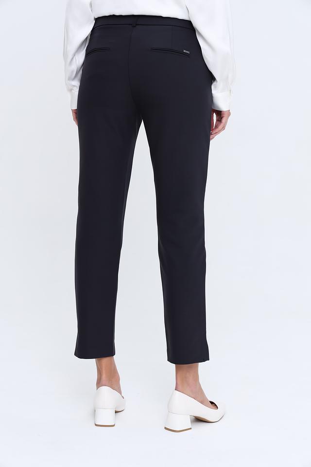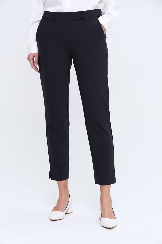 Цвет брюк — насыщенный чёрный. Модель отличается минималистичным дизайном без лишних деталей, что делает её универсальной и подходящей для сочетания с различными видами верха. Брюки имеют стандартную длину и подойдут для ношения с туфлями или ботинками.
