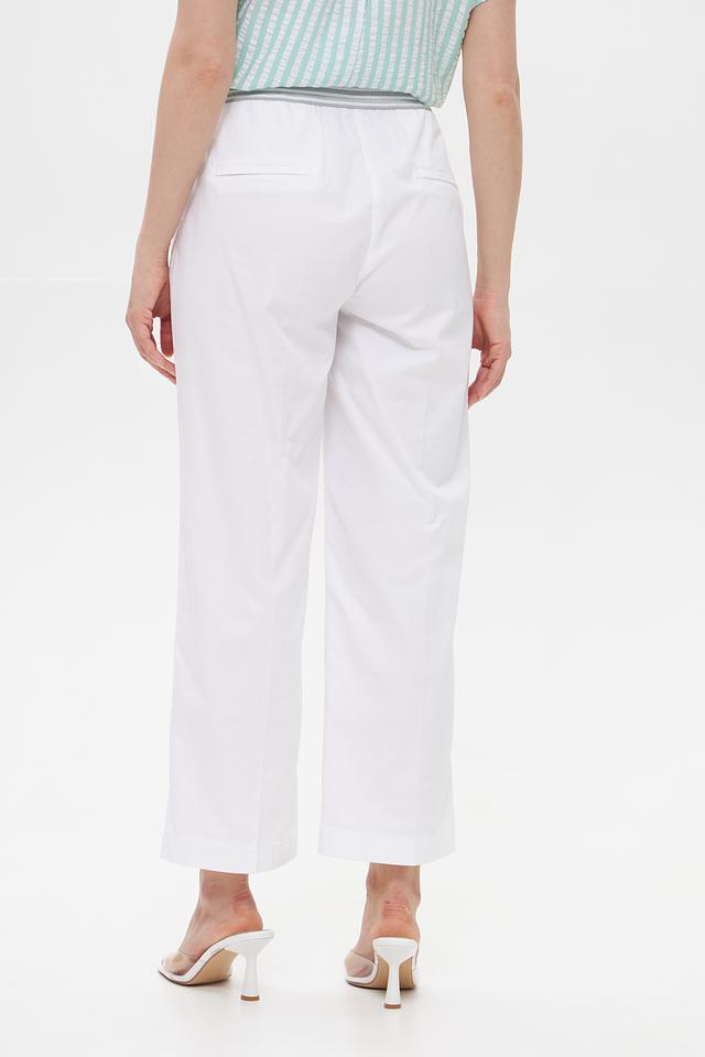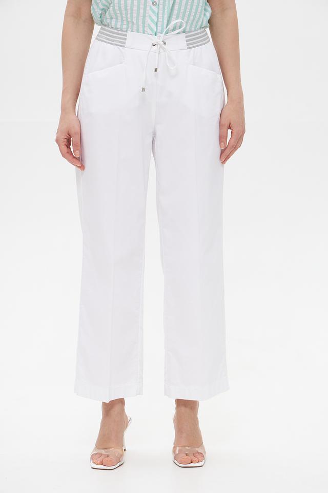 Брюки имеют прямой крой и слегка укороченную длину, что придает им современный вид. Эластичный пояс с завязками обеспечивает комфортную посадку и позволяет регулировать облегание.