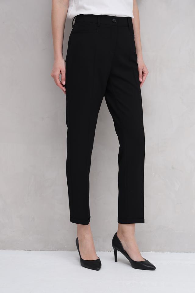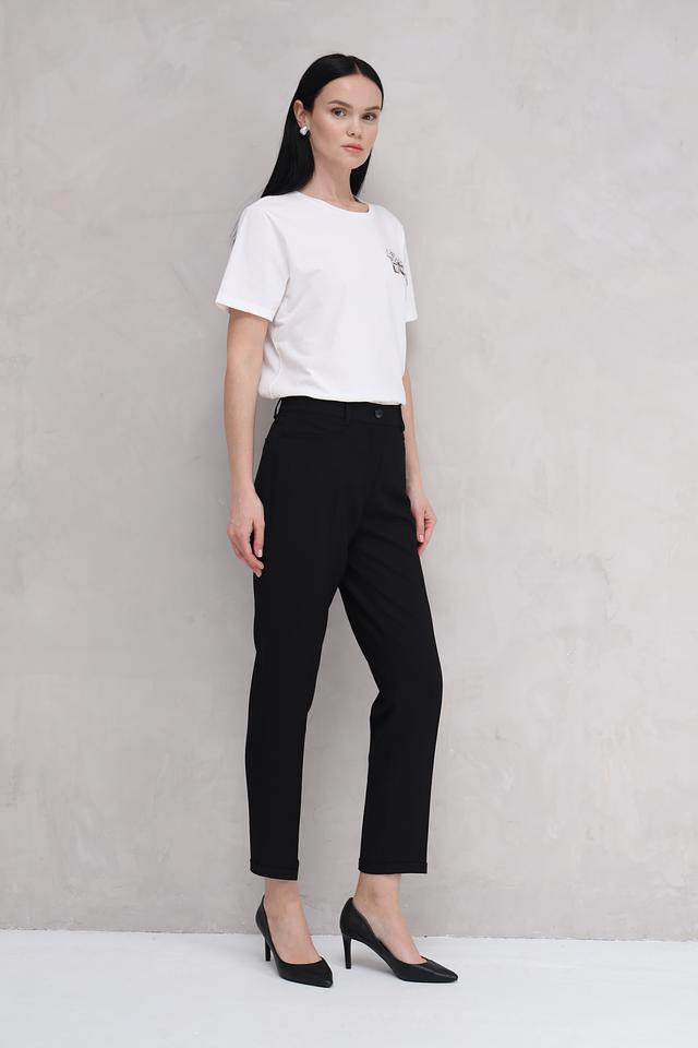 Брюки имеют высокую посадку, прямой крой и слегка зауженный силуэт к низу, что обеспечивает комфортную посадку и визуально удлиняет ноги. На поясе предусмотрена аккуратная застёжка на пуговицу и молнию. Брюки дополнены небольшими складками спереди, придающими им более элегантный вид.