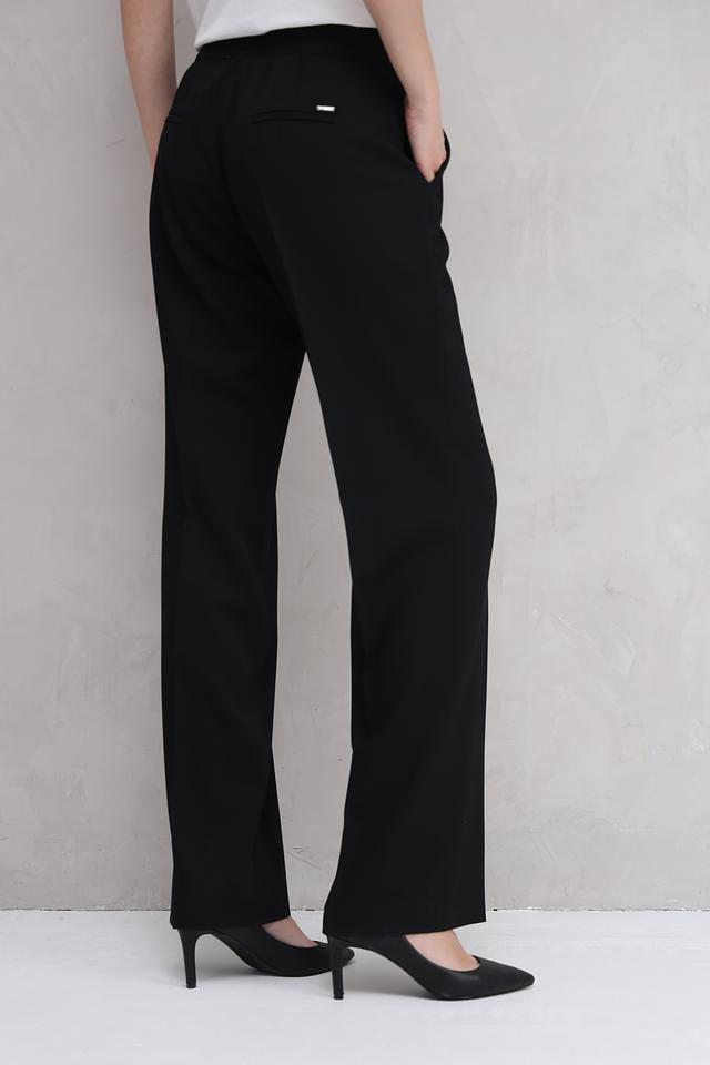 Брюки имеют прямой крой и стандартную посадку по талии. Застежка на молнию и пуговицу обеспечивает надежную фиксацию. На брюках предусмотрены боковые карманы. Ткань состоит из 100% полиэстера, что обеспечивает легкость и практичность в уходе.