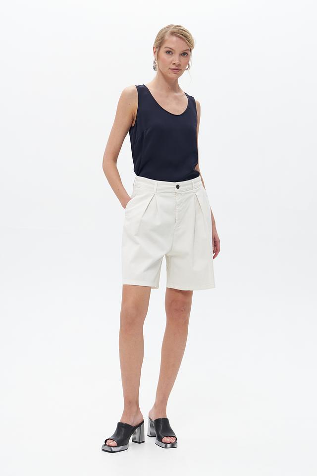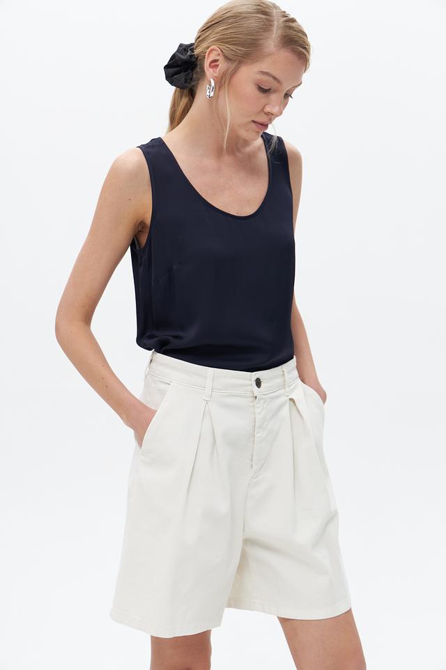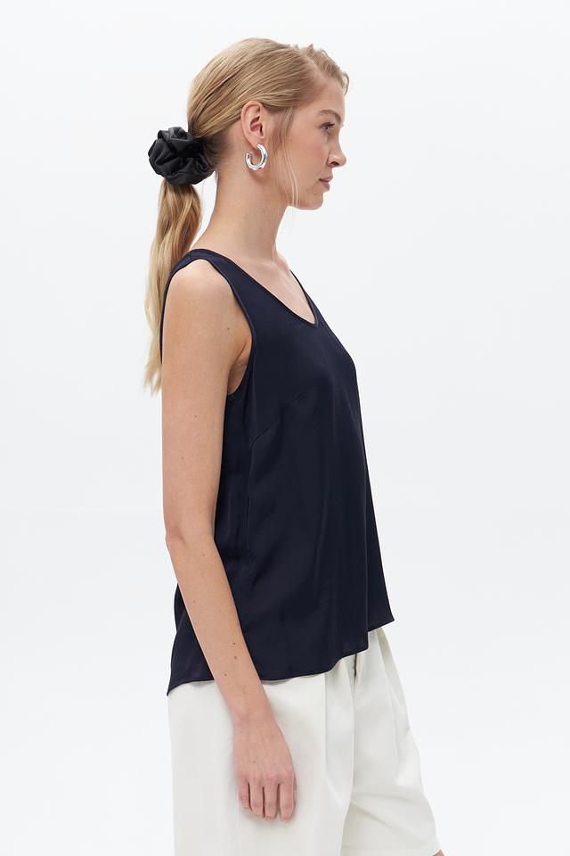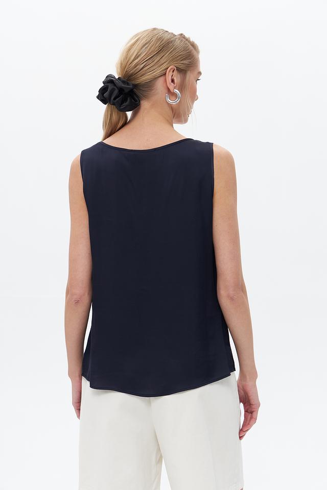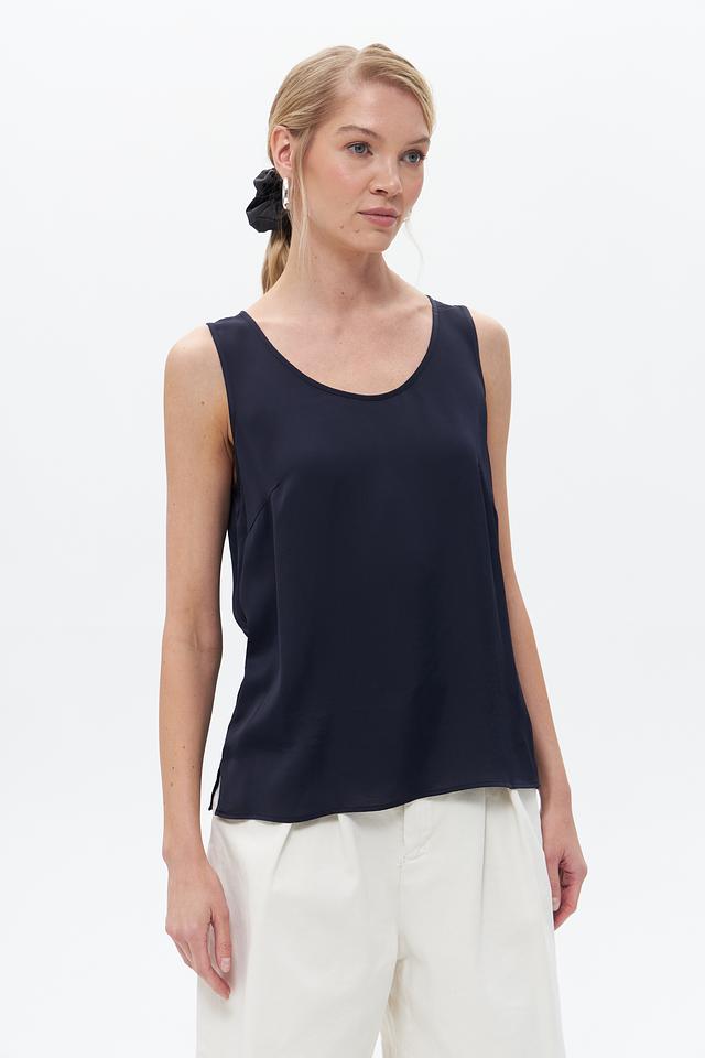 Топ имеет прямой крой и круглый вырез горловины. Отсутствие рукавов делает его идеальным для тёплой погоды или для создания многослойных образов. Минималистичный дизайн позволяет сочетать этот топ с различными элементами одежды – от классических брюк до джинсов.