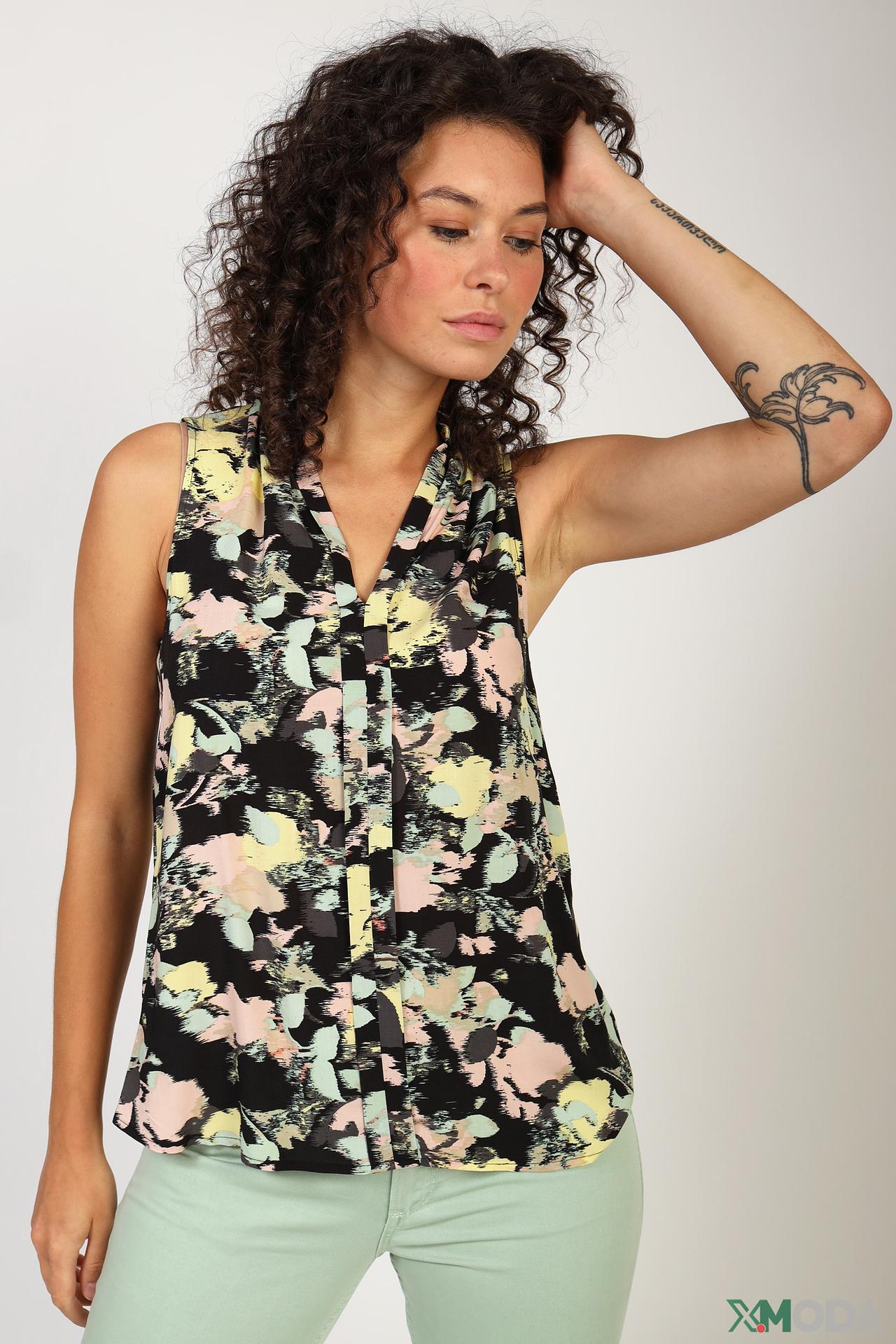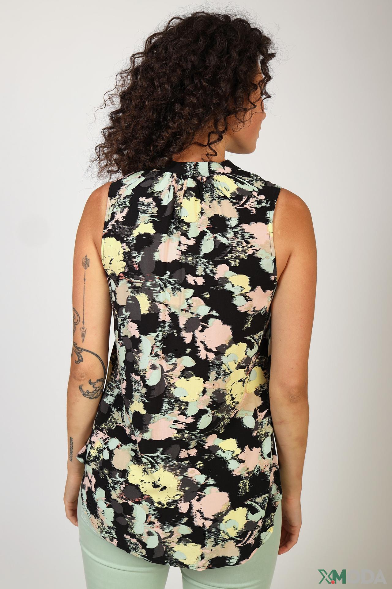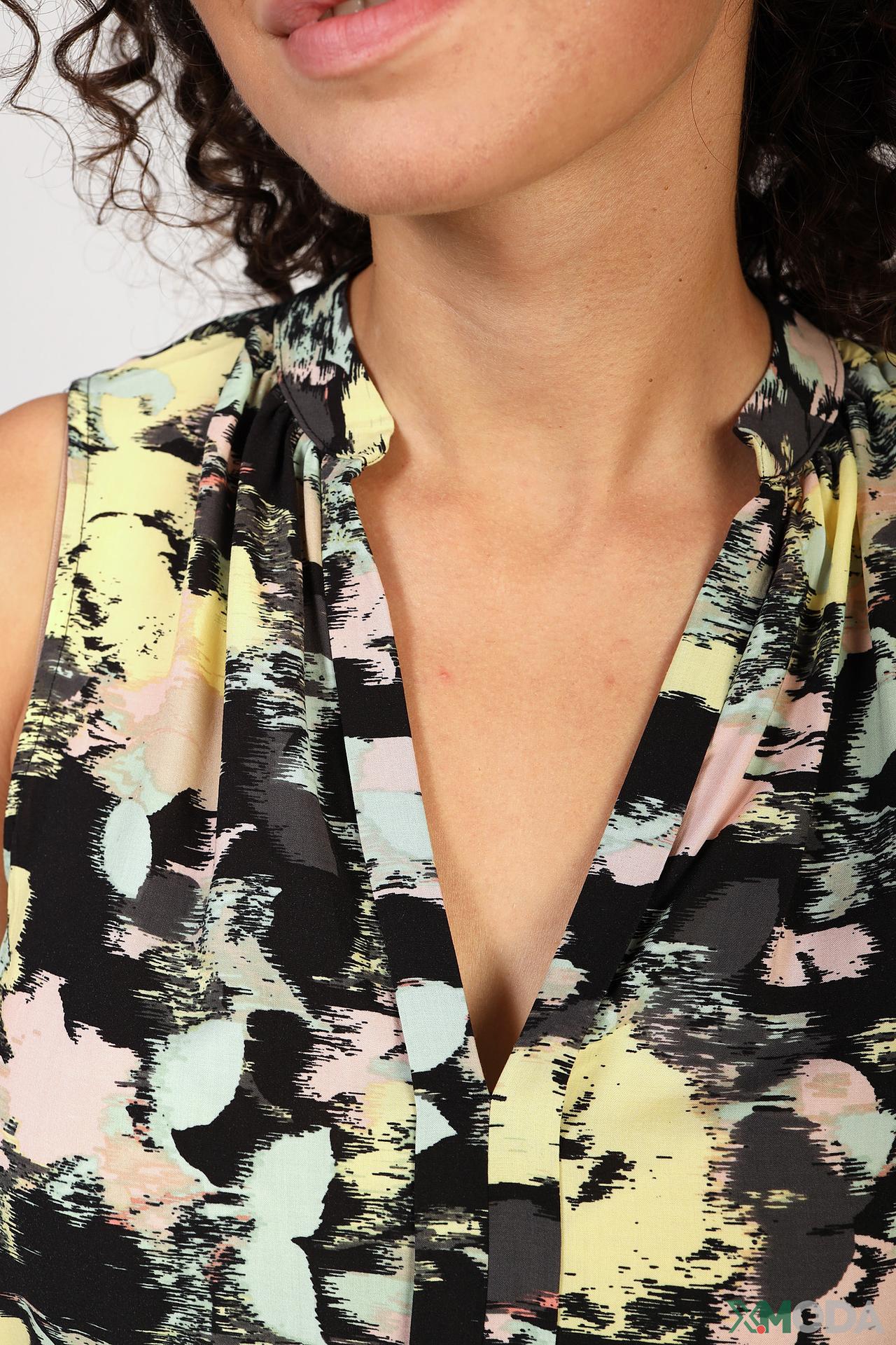 Топ QS из 100% вискозы — идеальный выбор для создания легких и стильных образов. Этот женский топ без рукавов сочетает в себе комфорт натуральных тканей и современный дизайн, что делает его незаменимым элементом летнего гардероба. Яркий абстрактный принт на черном фоне с вкраплениями желтого, розового, зеленого и серого цветов придает изделию динамичность и свежесть.