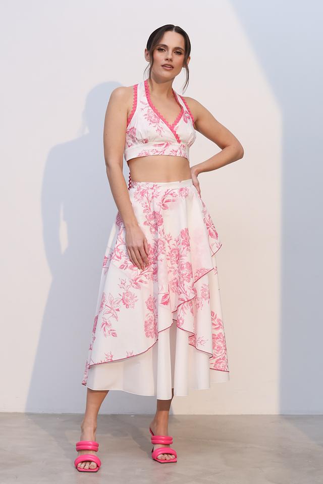 Топ имеет нежно-розовый цвет и украшен изысканным цветочным принтом, который придает ему романтичное настроение. Открытая спина и тонкие бретели добавляют образу легкости и женственности.