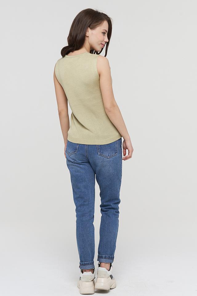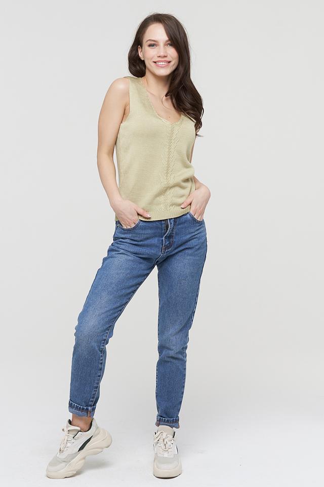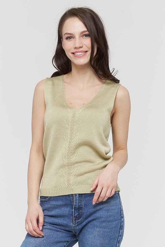 Оливковый топ VAY из мягкого вязаного полотна. Модель без рукавов с V-образным вырезом и декоративной вязкой на передней части. Идеально дополнит повседневный образ. Состав: вискоза 50%, пан 30%, хлопок 20%