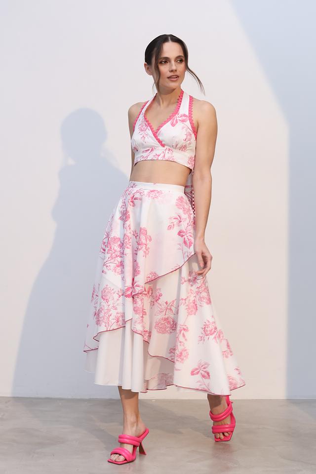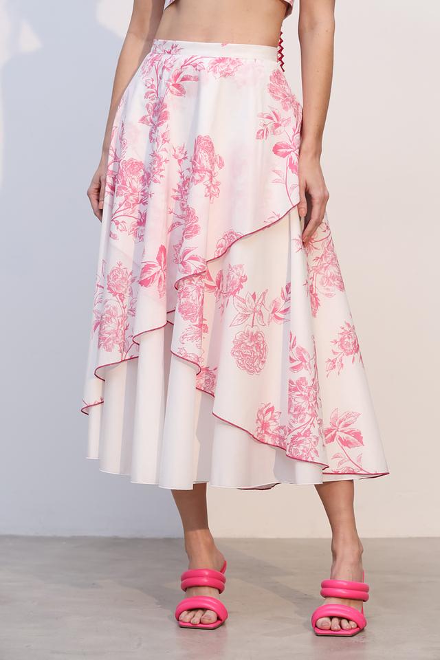 Юбка имеет нежно-розовый цвет и украшена ярким цветочным принтом, который придает ей особую изысканность. Асимметричный крой и многослойный дизайн создают эффект легкости и динамики.