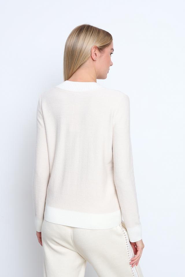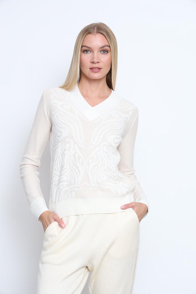 Бежевый джемпер от Tricot Chic с V-образным вырезом и оригинальным узором. Изготовлен из мягкого и приятного к телу сочетания вискозы, полиамида, шерсти, кашемира и эластана. Состав: вискоза 50%, полиамид 17%, эластан 15%, шерсть 15%, кашемир 3%