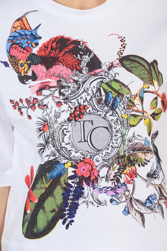 Белая футболка Tricot Chic с ярким цветочным принтом и изображением птиц. Изготовлена из 100% хлопка, обеспечивая комфорт и воздухопроницаемость. Стильный и оригинальный дизайн для создания неповторимого образа. Состав: хлопок 100%
