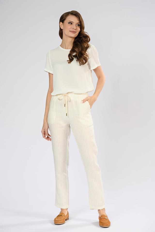 Состав ткани: 50% лен, 47% хлопок, 3% вискоза. Лен придает брюкам лёгкость и воздухопроницаемость, хлопок — мягкость и комфорт, а вискоза — приятную текстуру и небольшой блеск.