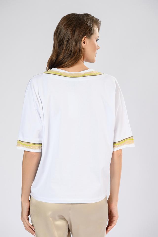 Особенностью модели является V-образный вырез, который подчеркивает женственность и изящество. Декоративная отделка люрексом придает блузе праздничный и нарядный вид. Короткие рукава делают ее идеальным выбором для теплой погоды.