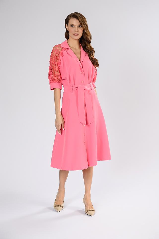 Модель отличается оригинальным дизайном: воротник рубашечного типа, застёжка на пуговицы по всей длине и пояс, акцентирующий талию. Рукава 3/4 выполнены из изящного кружева, добавляющего образу романтичности.