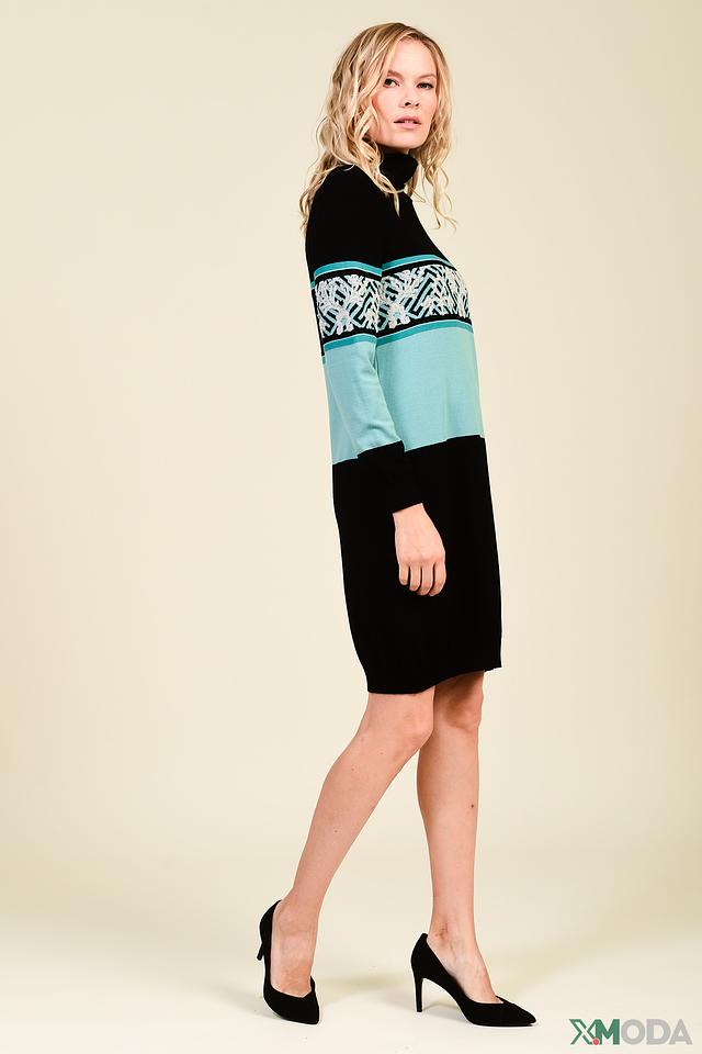 Платье от Tricot Chic черного и бирюзового цвета с оригинальным жаккардовым узором. Модель выполнена из мягкого трикотажа с добавлением шерсти и кашемира для комфорта и тепла. Состав: вискоза 75%, эластан 9%, полиамид 9%, шерсть 5%, кашемир 2%