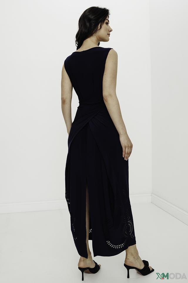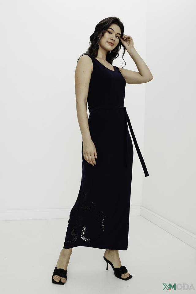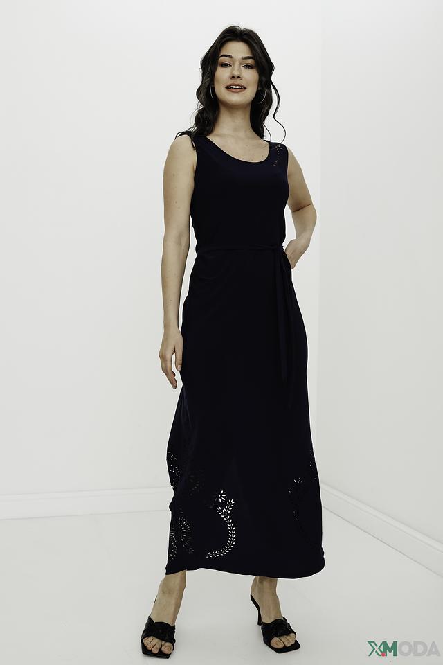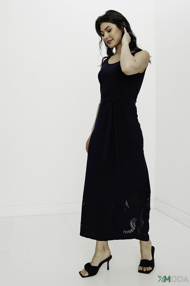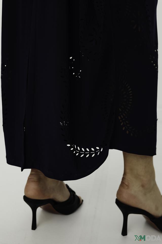 Модель имеет прямой силуэт, длину миди и удобный вырез горловины. Лиф платья украшен декоративными вырезами, добавляющими изысканности. Юбка также имеет ажурные элементы, создающие лёгкий и воздушный образ.