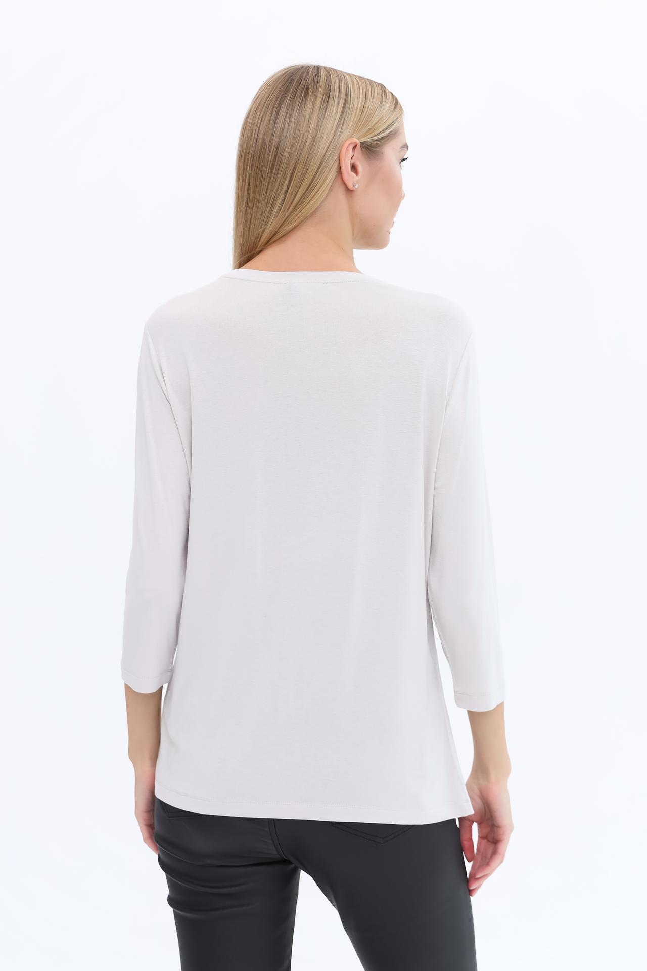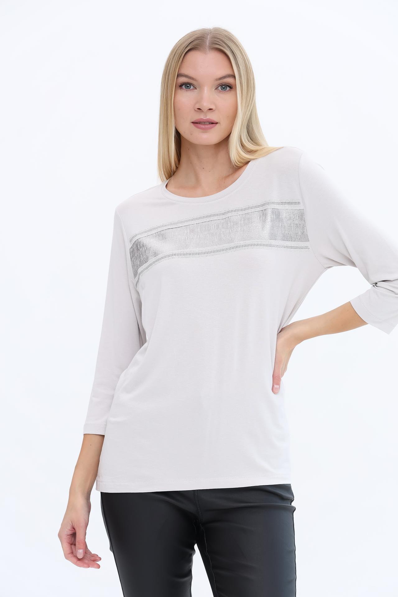Лонгслив украшен серебристой декоративной вставкой, добавляющей изысканности и шарма. Он легко сочетается с различными элементами гардероба, создавая как повседневные, так и более нарядные образы.