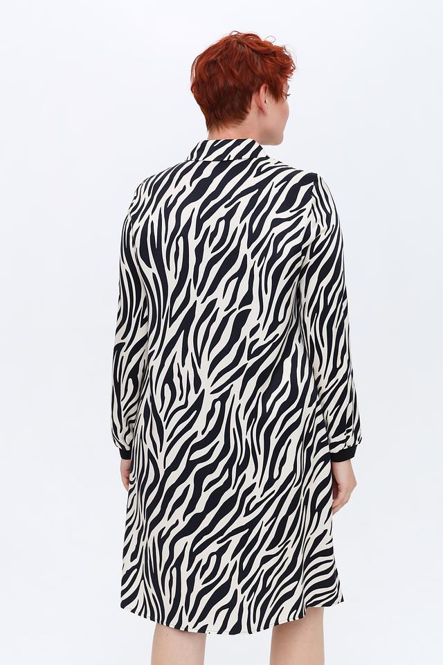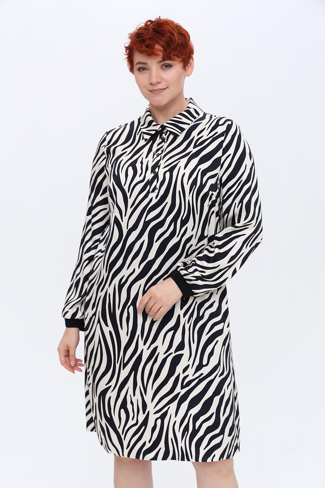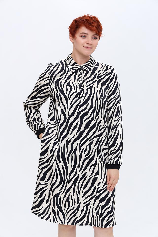 Это приталенное платье от бренда Tuzzi выполнено в оригинальном дизайне с принтом, имитирующим шкуру зебры. Сочетание черного и белого цветов делает его универсальным и подходящим для различных случаев.