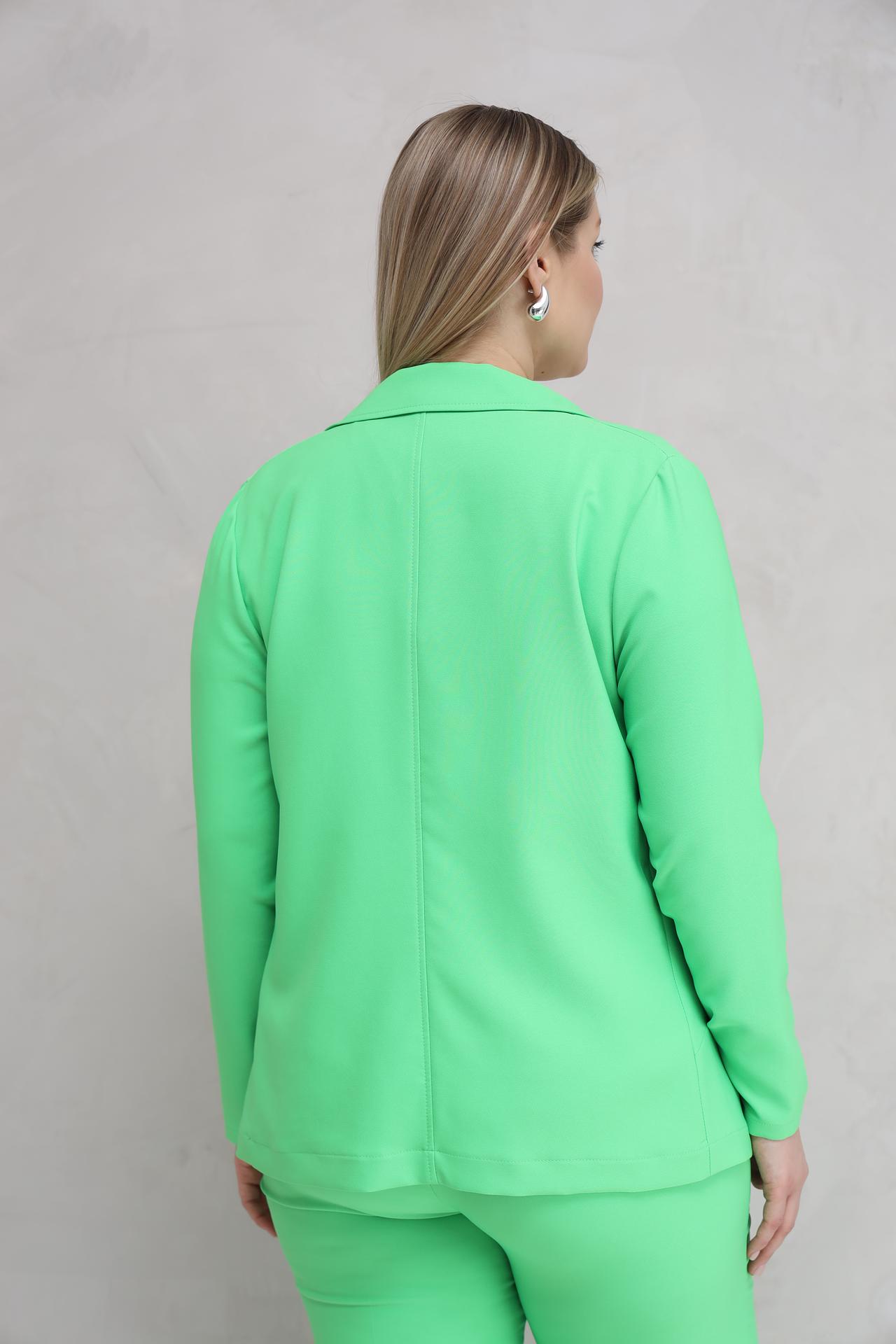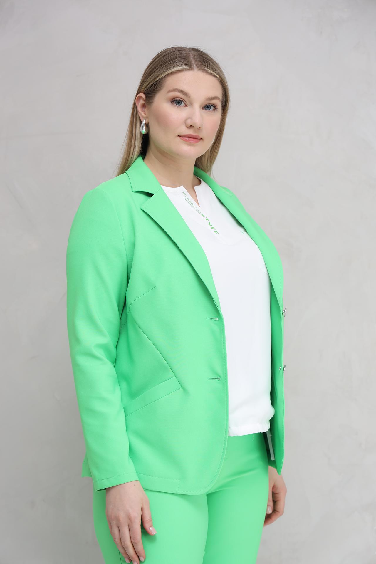 - Яркий акцент: Сочный зелёный оттенок жакета привлекает внимание и освежает образ. Этот цвет легко интегрируется в различные цветовые комбинации, позволяя экспериментировать со стилем.