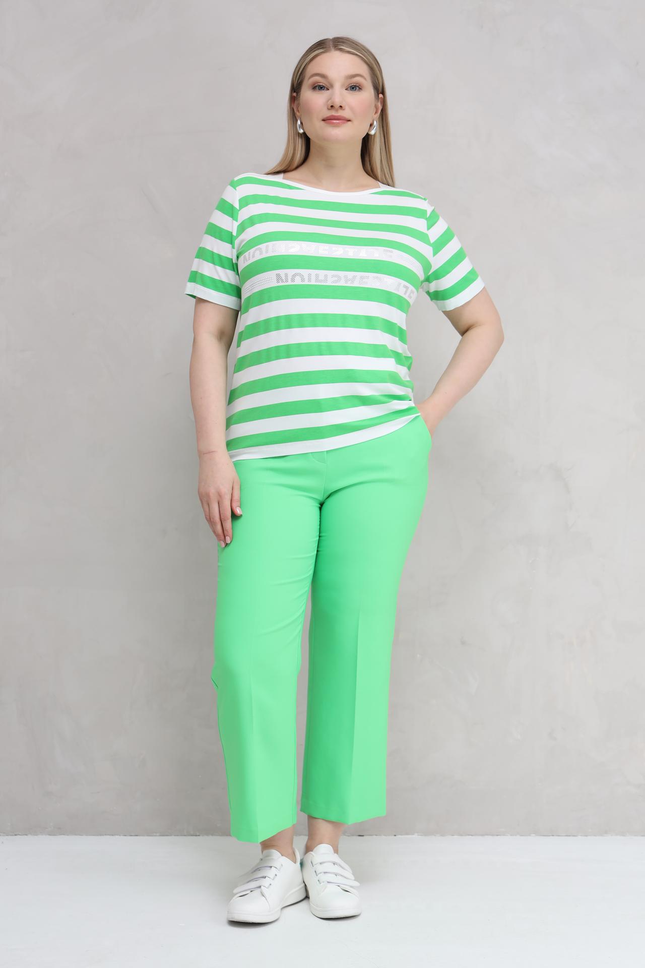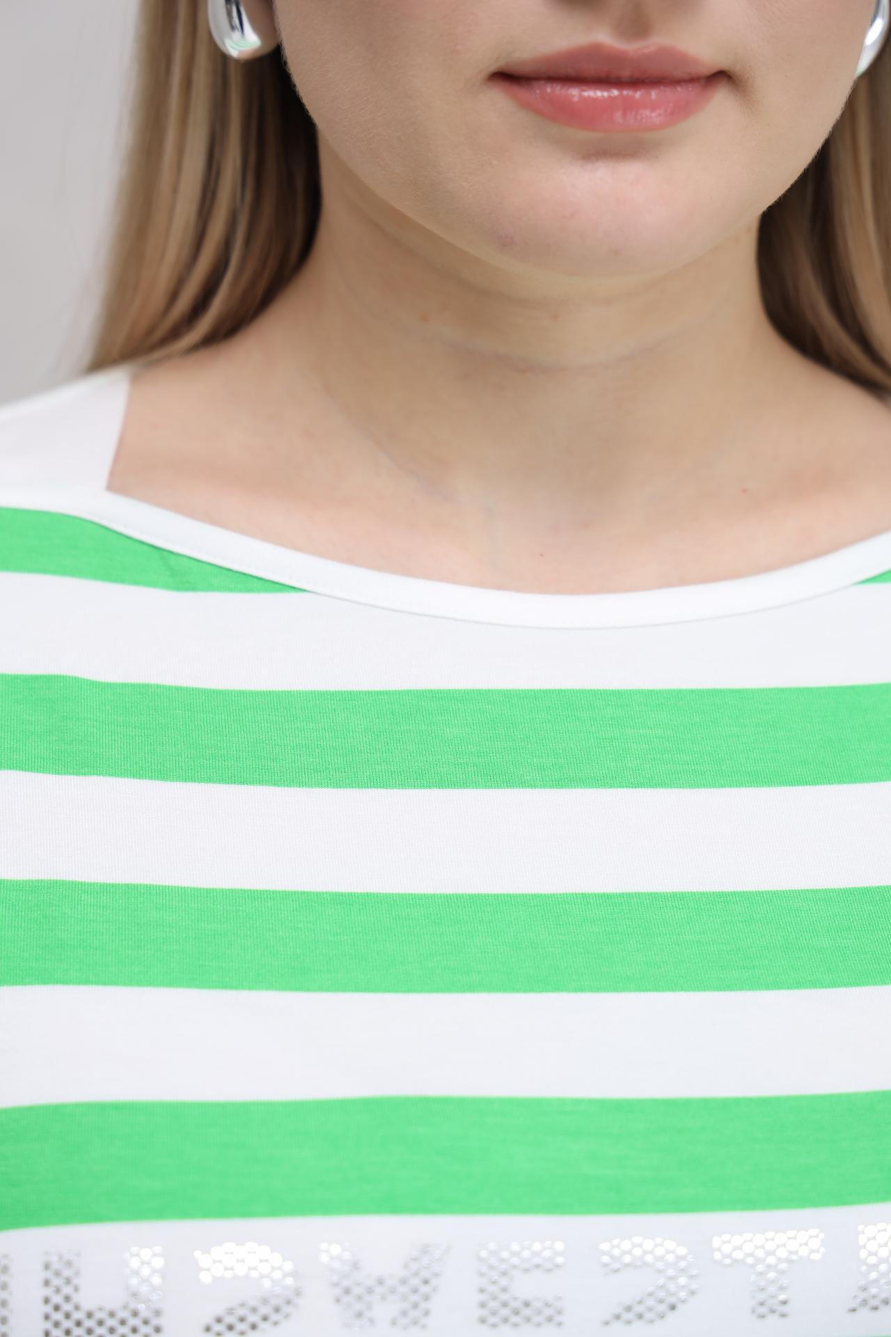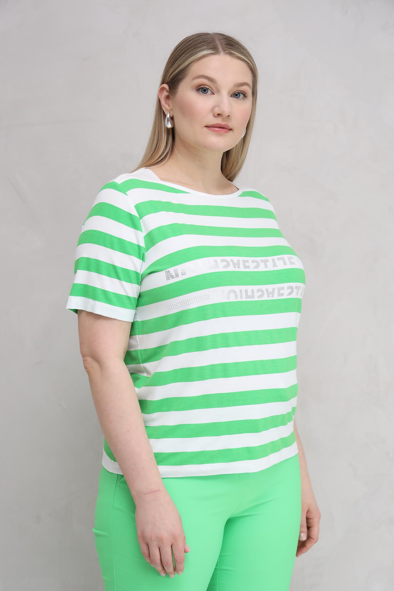 - Стильный дизайн: Полосатый принт и декоративная надпись придают футболке модный и современный вид.