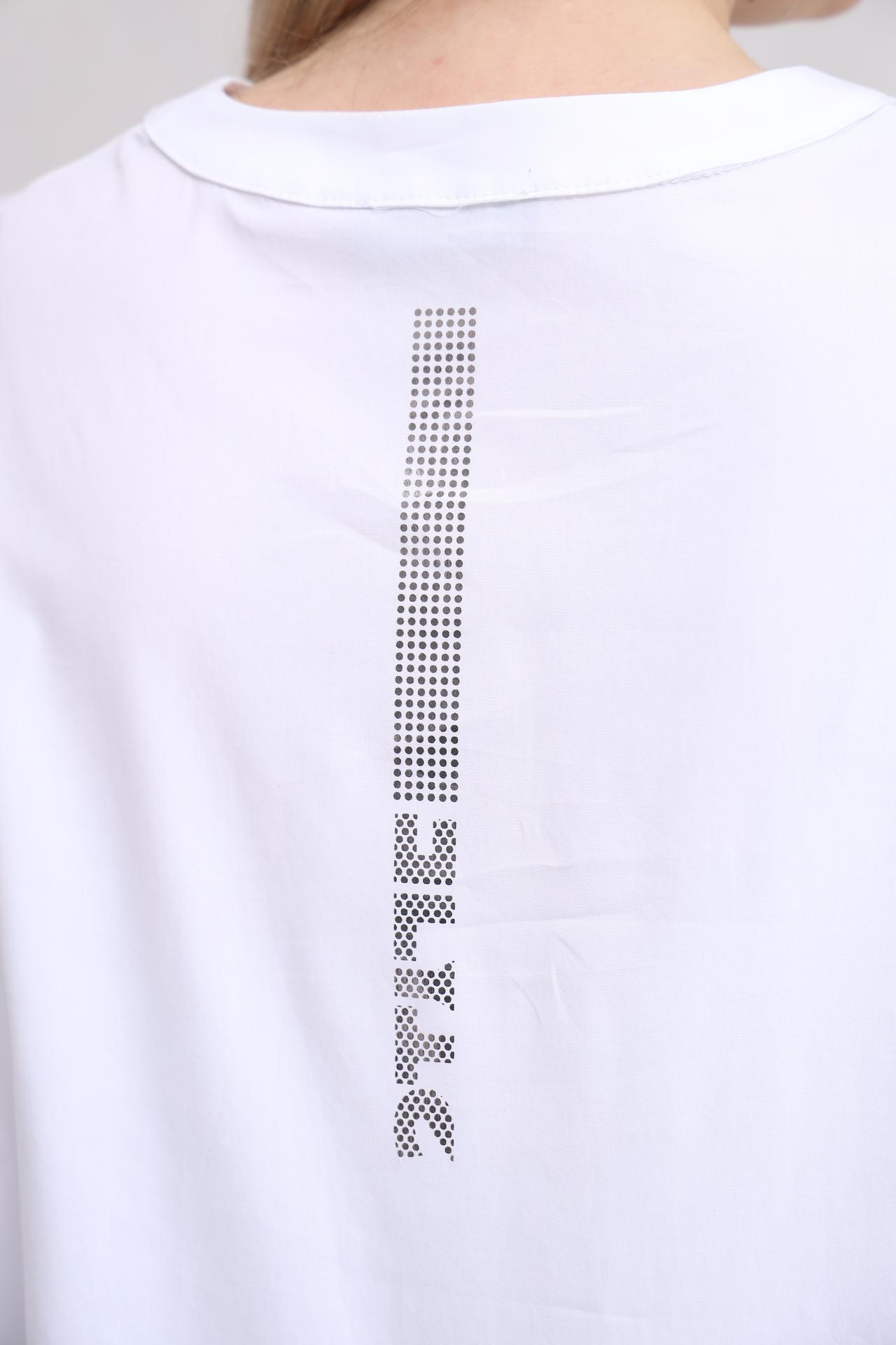 - Оригинальные детали: V-образный вырез с темно-синей отделкой и перфорированная надпись на спине придают блузе неповторимый шарм.