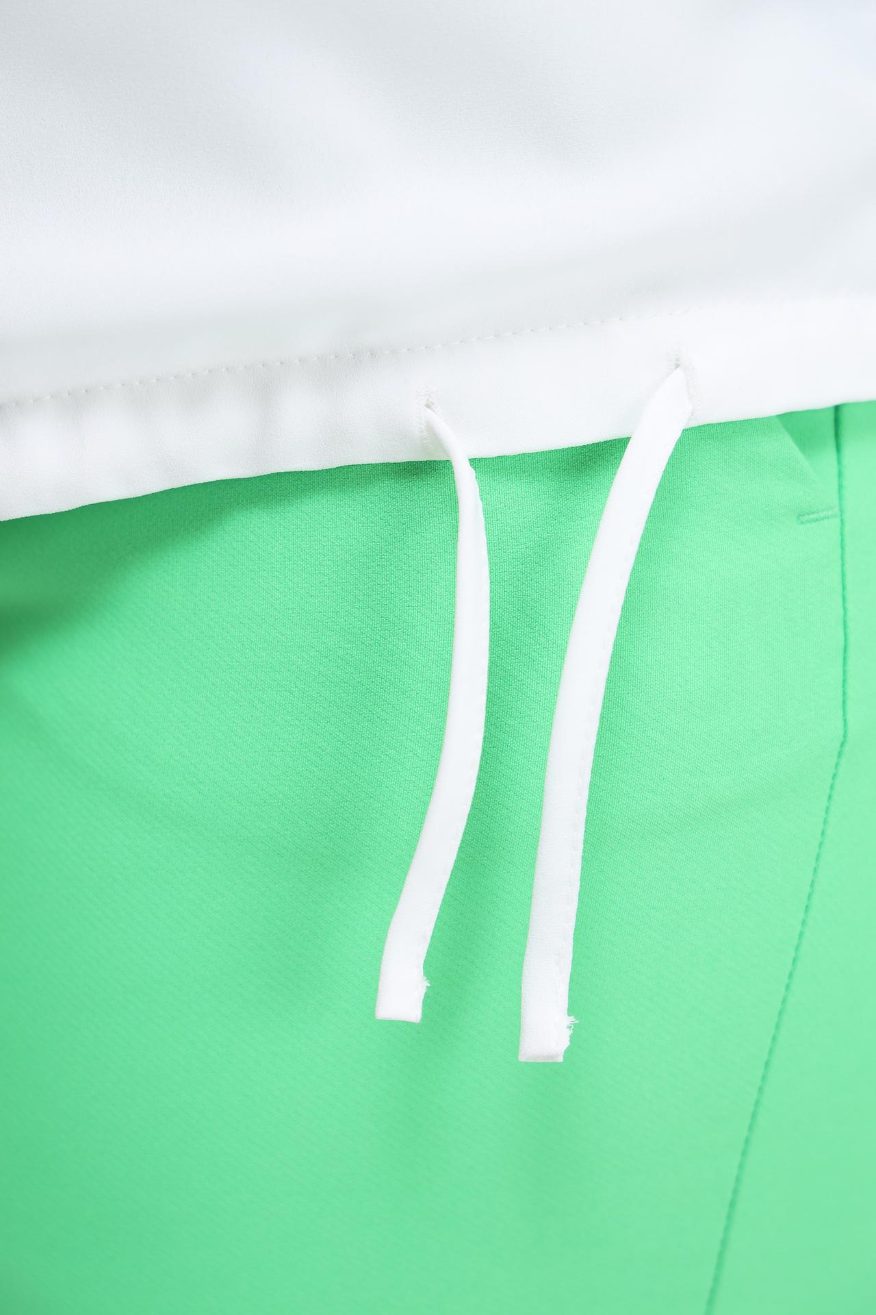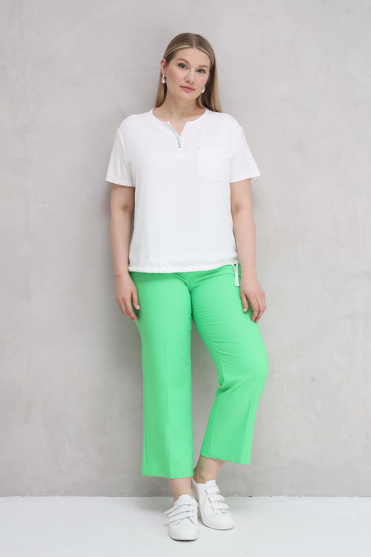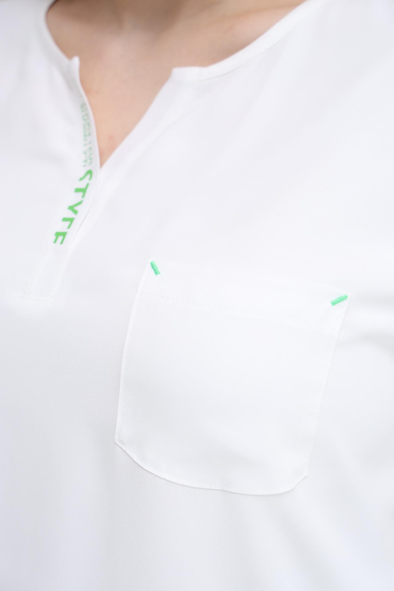- Продуманный дизайн: Модель имеет прямой крой, круглый вырез с небольшой V-образной вставкой, короткие рукава и накладной карман на груди. Яркие зелёные акценты придают изделию свежий и современный вид.