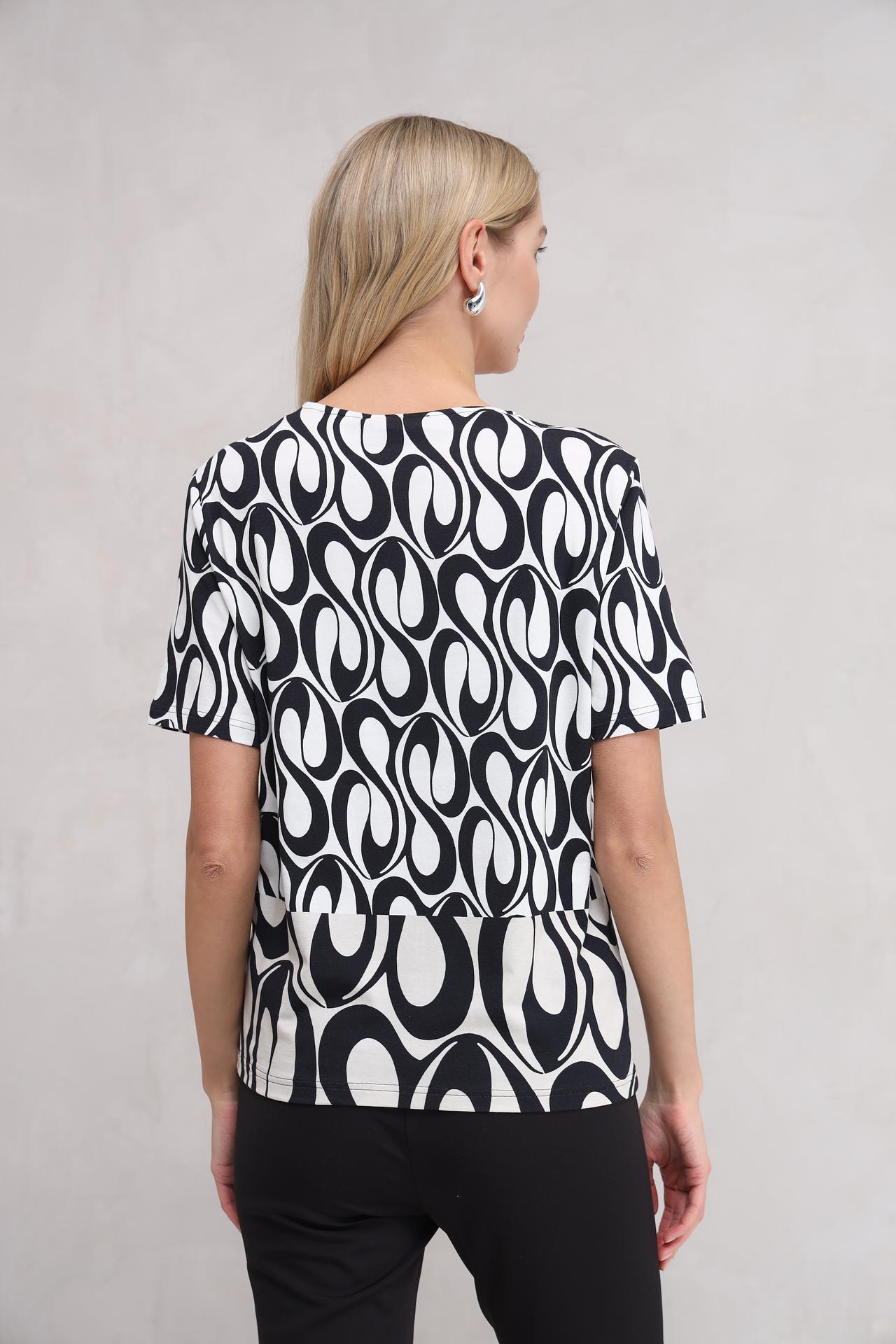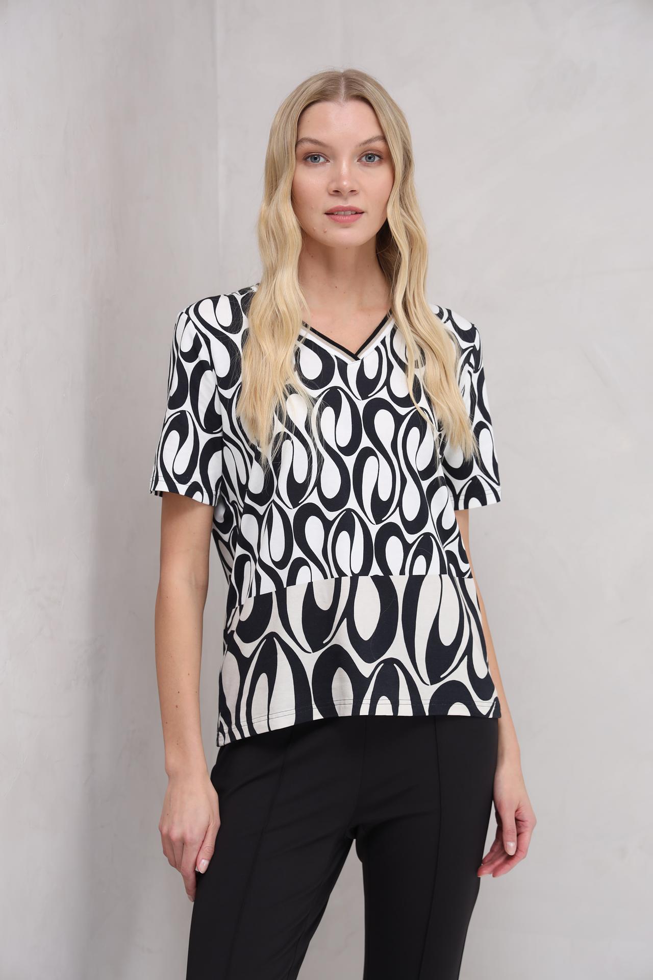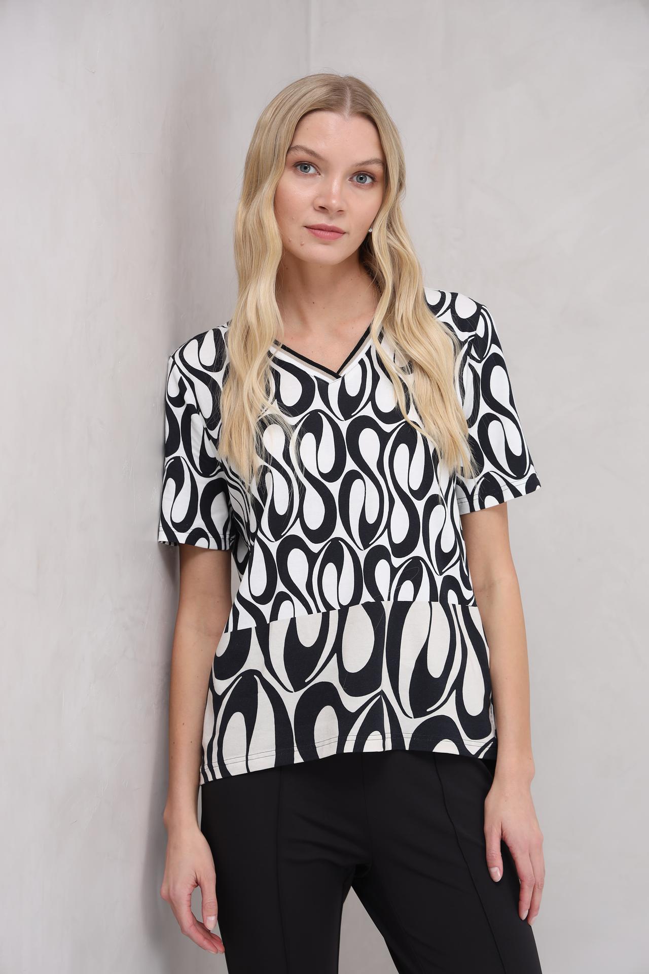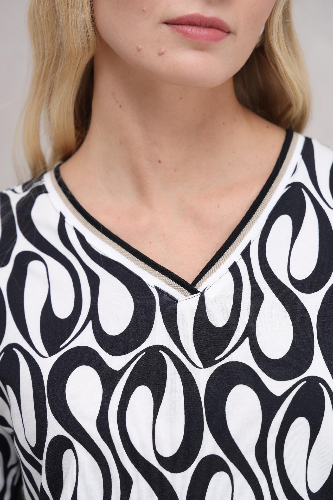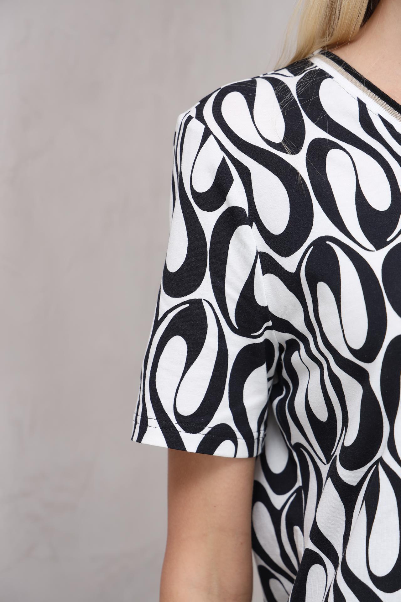 Футболка Tuzzi с эксклюзивным принтом в черно-белом исполнении. Оригинальный узор привлекает внимание, делая образ запоминающимся. V-образный вырез горловины с декоративной отделкой придает изделию изысканность.