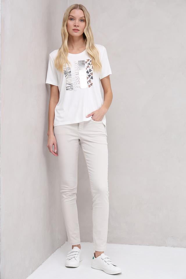 Белая футболка Tuzzi с оригинальным принтом – стильное и комфортное решение для повседневного образа. Изготовлена из мягкой вискозы с добавлением эластана, обеспечивающего удобную посадку. Состав: вискоза 95%, эластан 5%