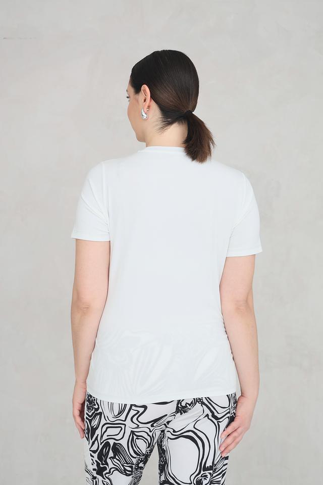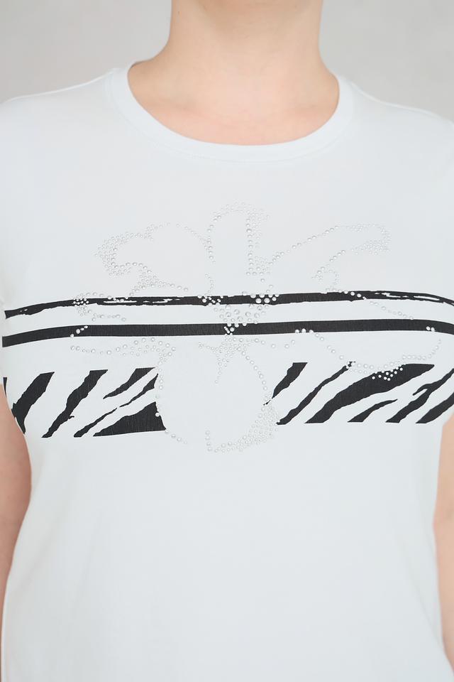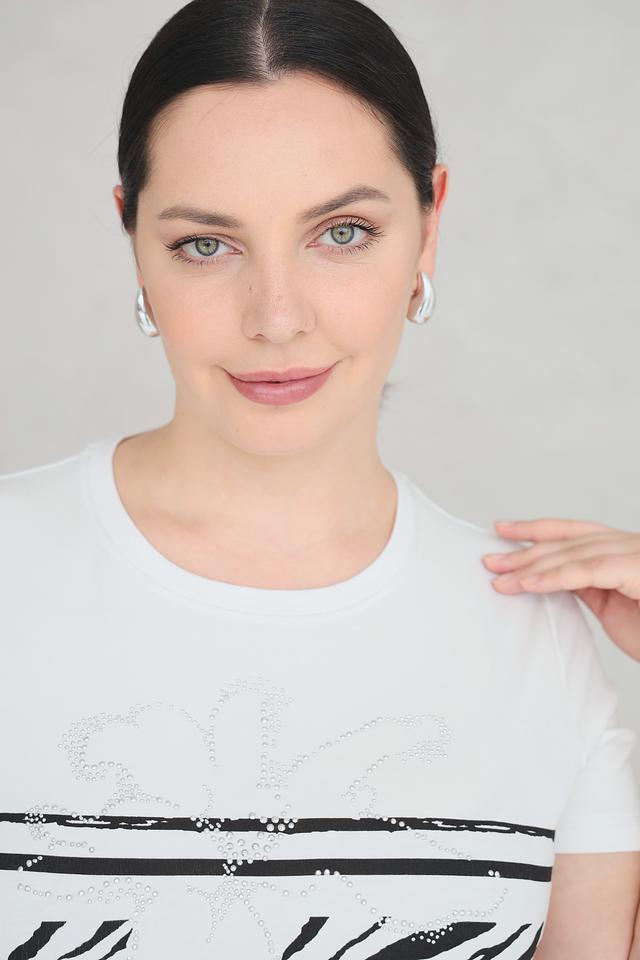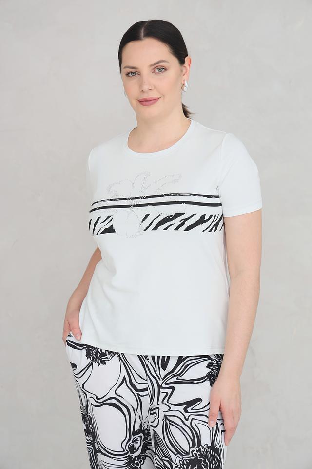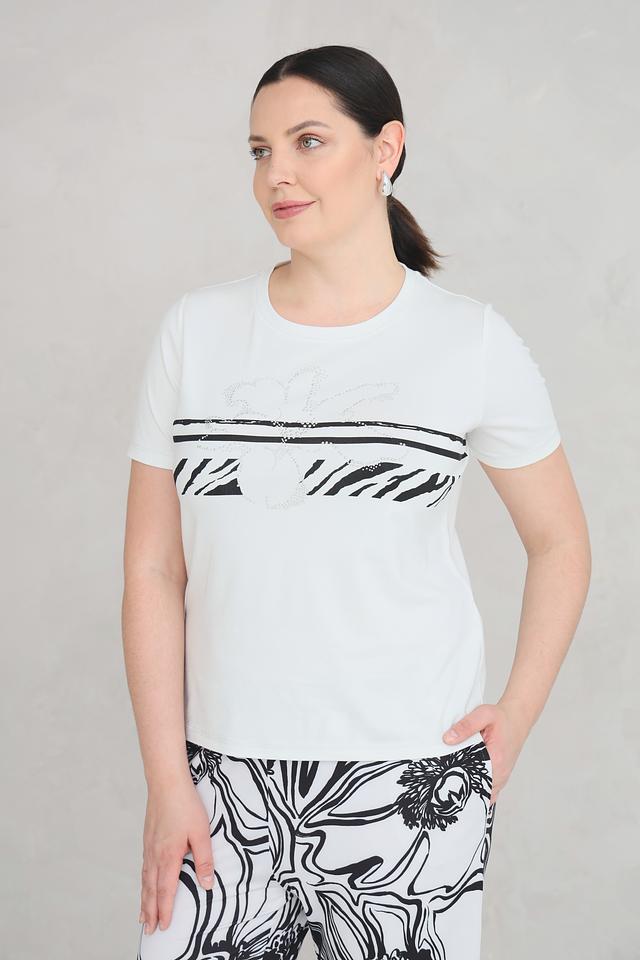 Белая футболка Tuzzi с оригинальным принтом – стильное и комфортное решение для повседневного образа. Изготовлена из мягкого и приятного к телу сочетания хлопка, модала и эластана, обеспечивающего удобную посадку. Состав: хлопок 46%, модал 46%, эластан 8%