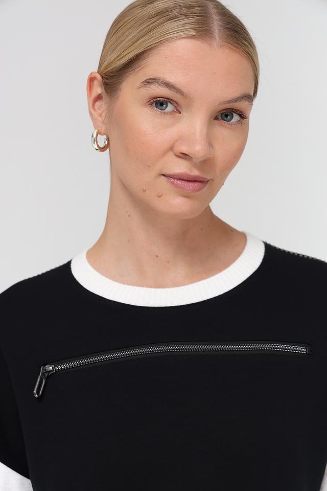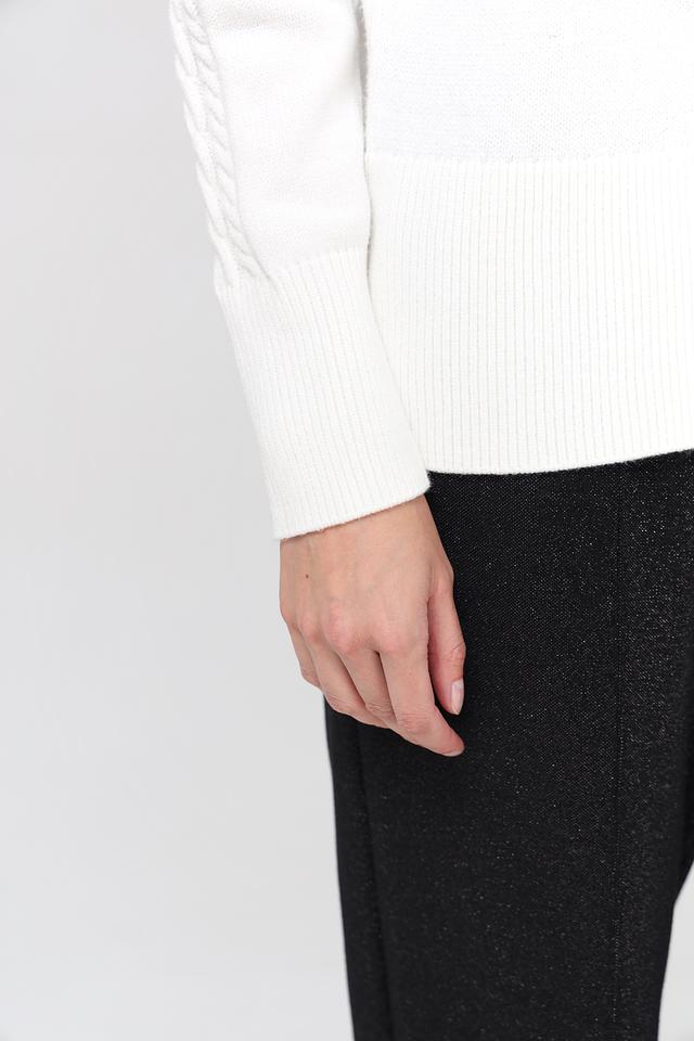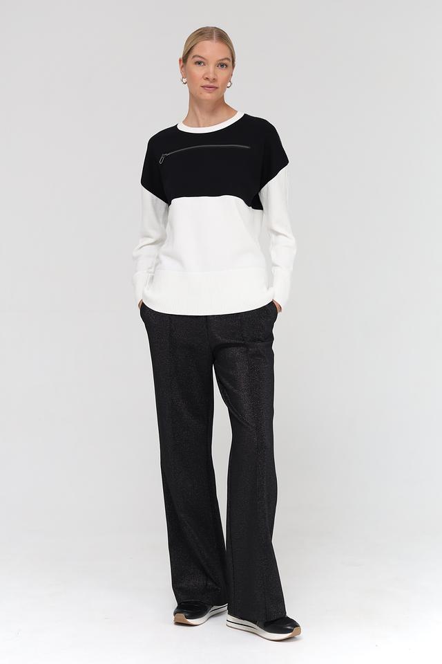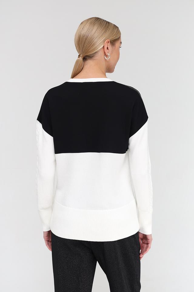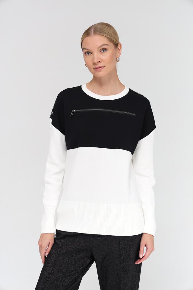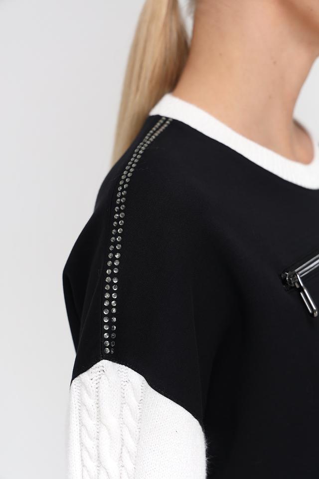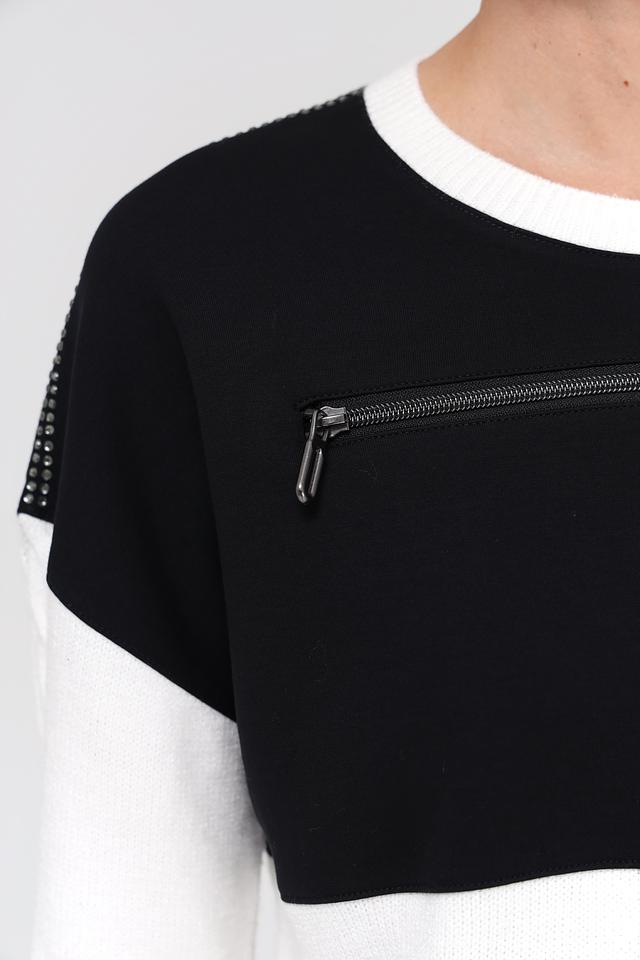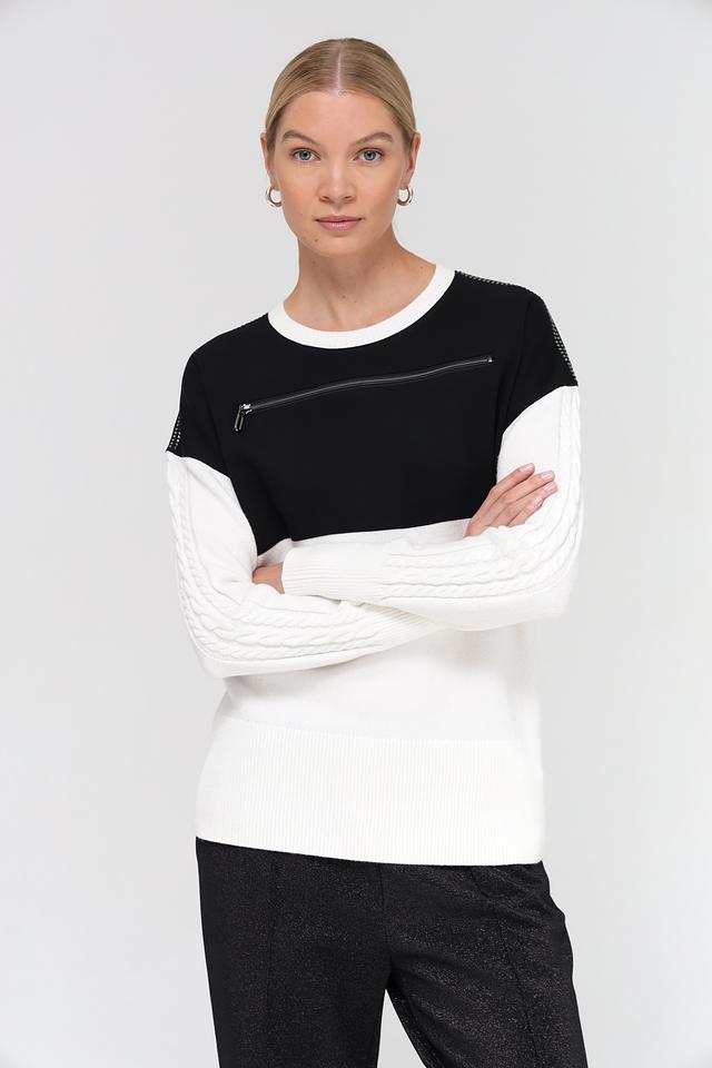 Пуловер выполнен в контрастной черно-белой цветовой гамме. Черная часть спереди украшена функциональной молнией, добавляющей динамики образу. Рукава выполнены белой вязкой с косами, что создает интересный акцент.