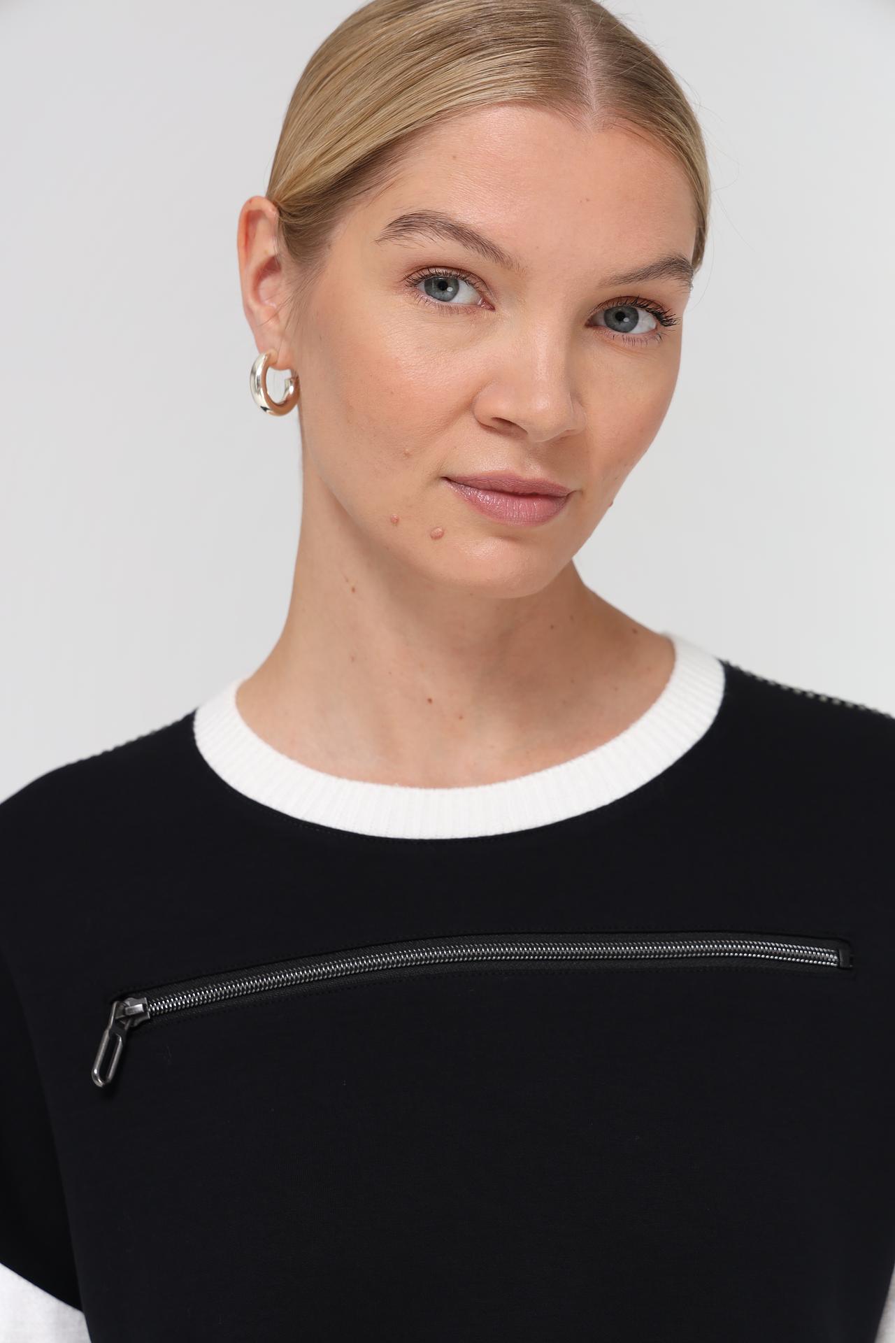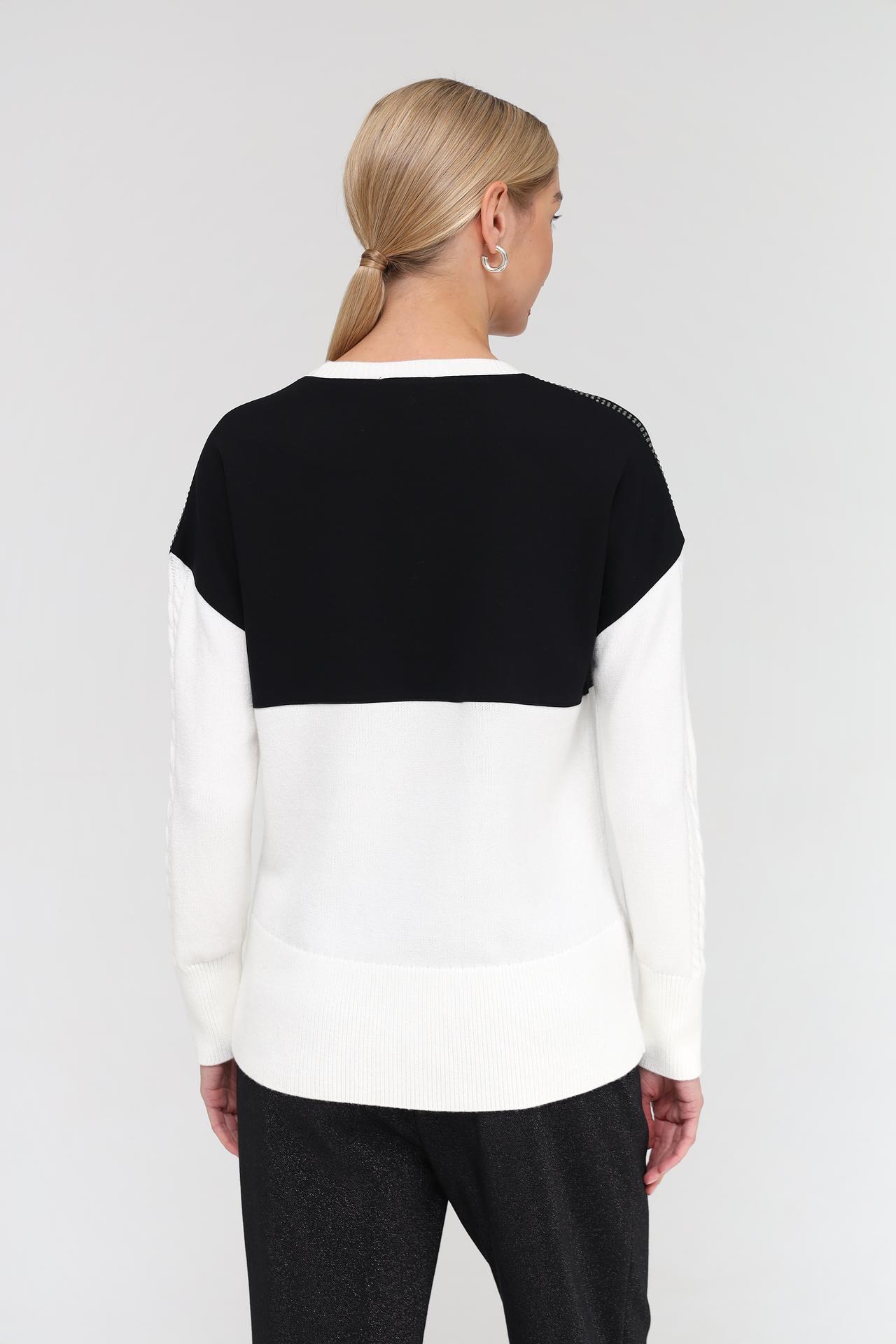 Элегантный женский пуловер от бренда Tuzzi, выполненный в классическом стиле. Сочетание черного и белого цветов создает контрастный и современный образ, а фактурные детали добавляют изысканности. Идеальный выбор для создания стильных повседневных и вечерних комплектов.