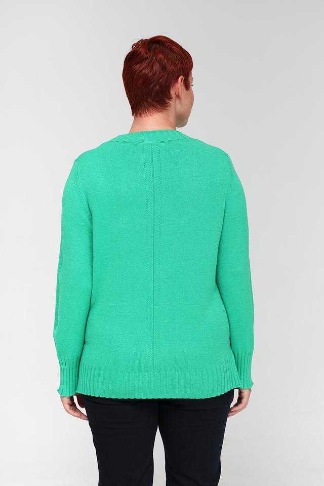 Пуловер имеет длинные рукава с манжетами и резинку по нижнему краю, что обеспечивает удобную посадку. Текстура вязки приятна на ощупь и не сковывает движений. Состав ткани включает 52% вискозы, 28% полиэстера и 20% полиамида, что гарантирует долговечность и простоту в уходе.