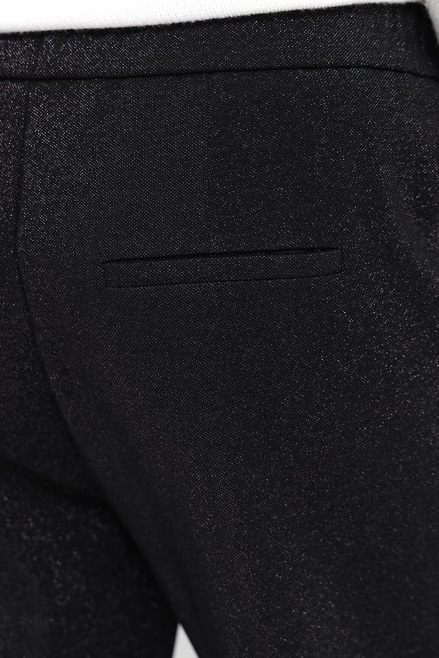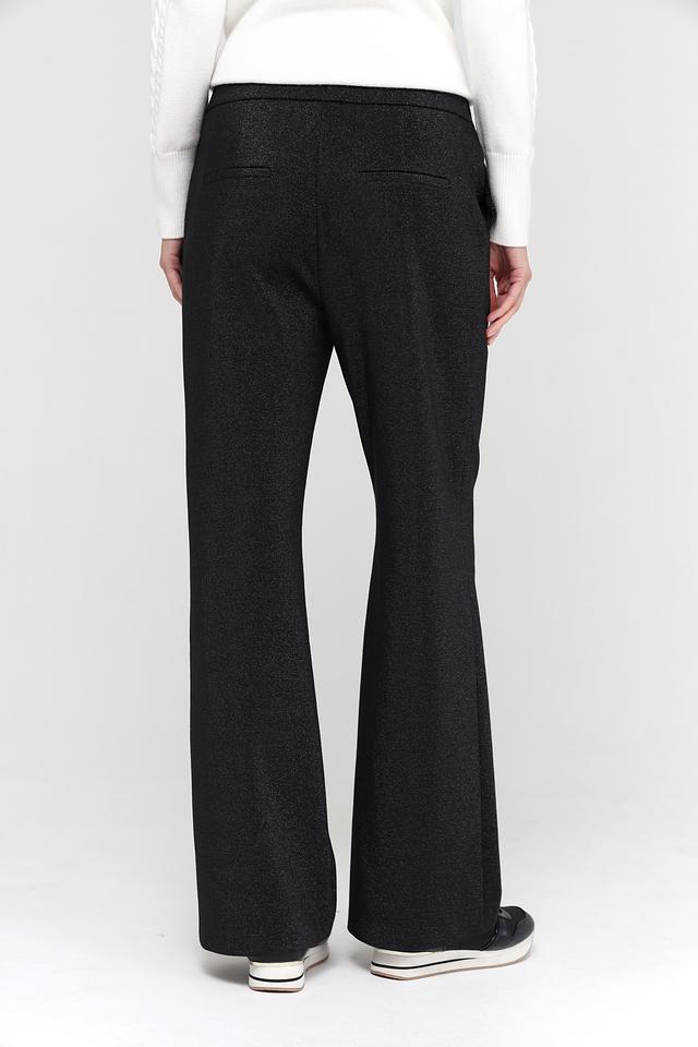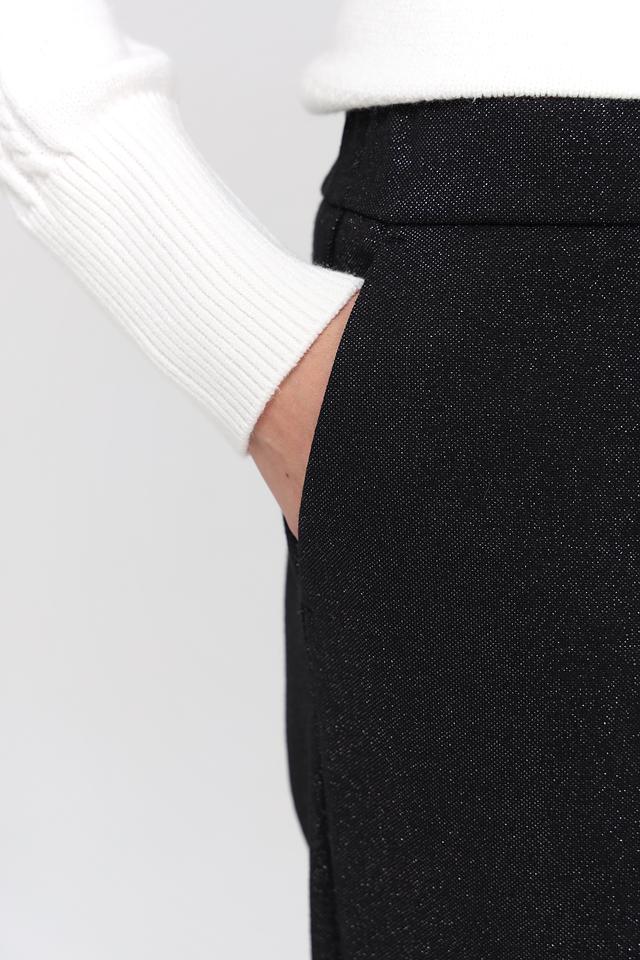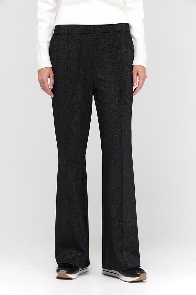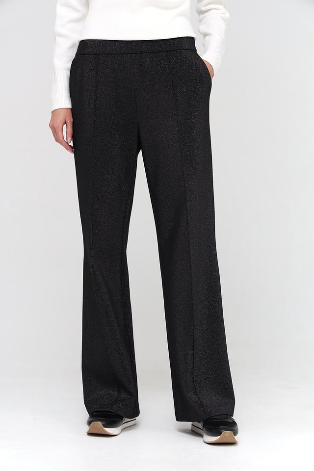 Брюки имеют прямой крой, который визуально удлиняет силуэт и обеспечивает свободу движений. Эластичный пояс гарантирует комфортную посадку по фигуре, не стесняя движений. Ткань с деликатным блеском придает брюкам особый шарм и элегантность.