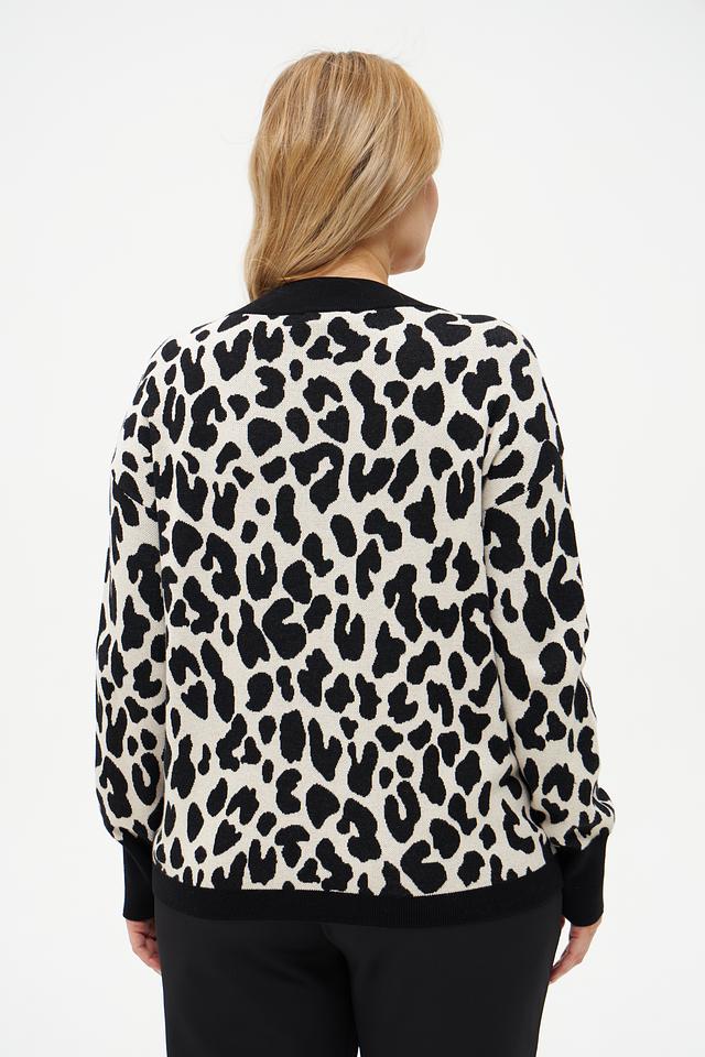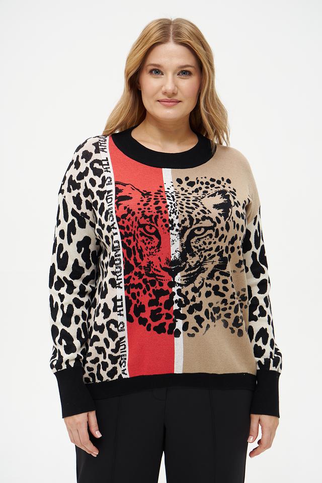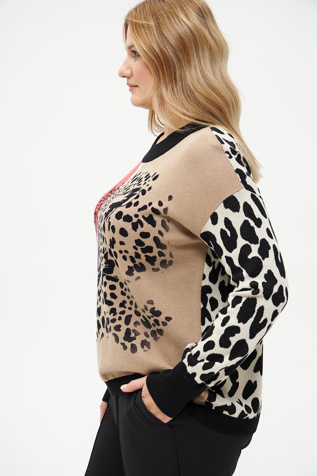 Пуловер имеет оригинальный принт, сочетающий в себе леопардовые пятна и изображение морды леопарда, а также надписи вдоль рукавов. Цветовая гамма включает в себя бежевый, чёрный и белый цвета, создавая эффектный контраст.