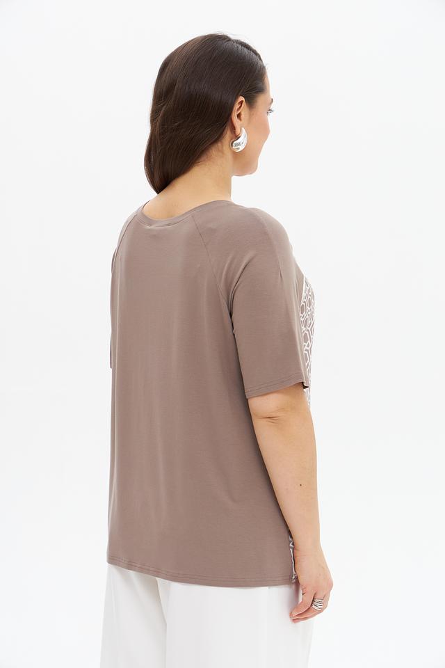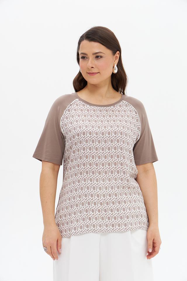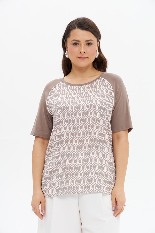 Блузка имеет свободный крой, короткие рукава и округлый вырез горловины. Передняя часть блузки украшена оригинальным геометрическим принтом в коричнево-бежевой гамме, а рукава и часть спинки выполнены в однотонном коричневом цвете.