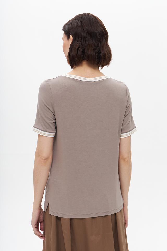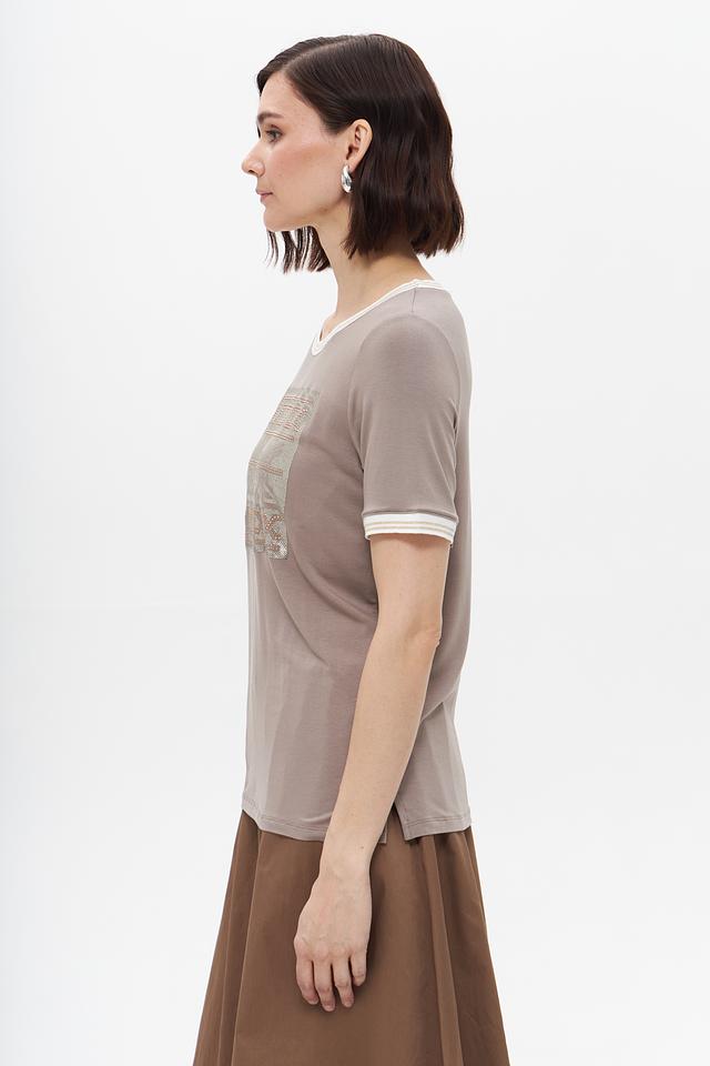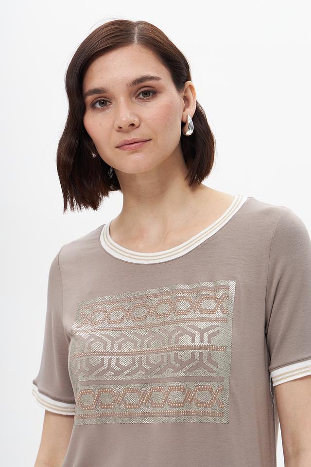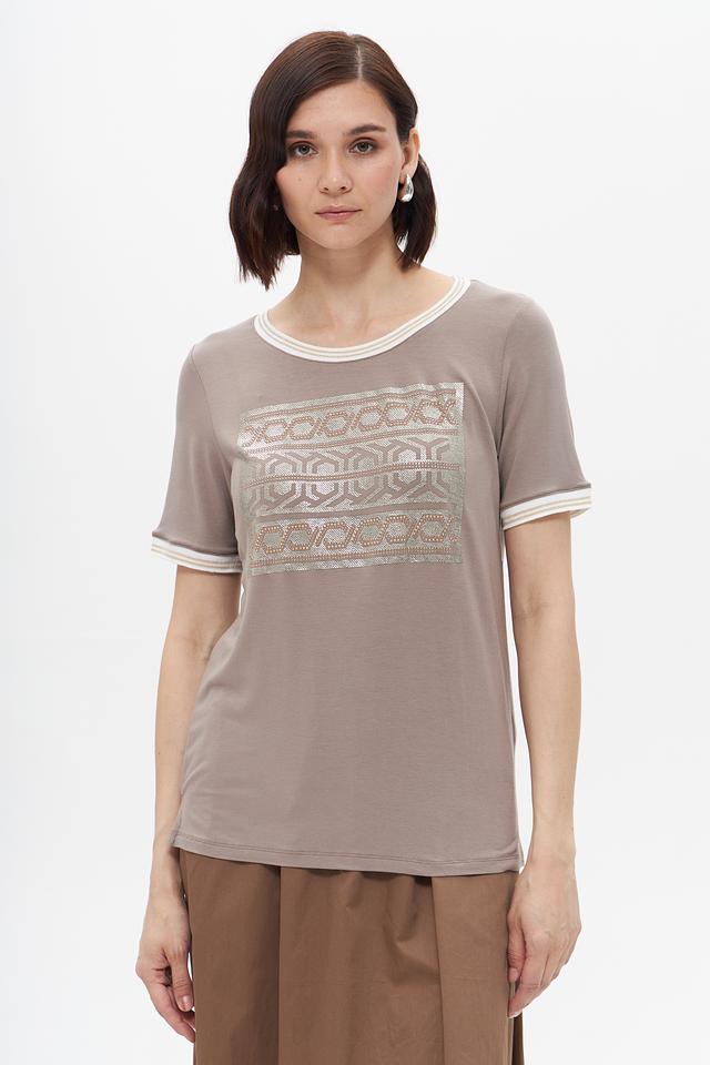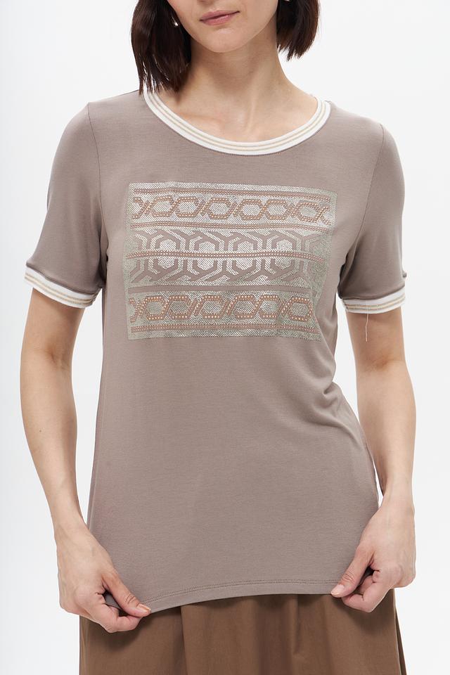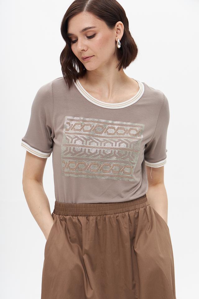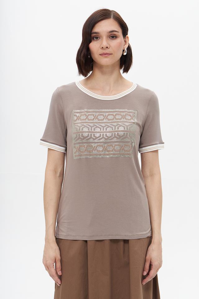 Бежевая футболка Tuzzi с оригинальным узором и отделкой белой полоской на горловине и рукавах. Изготовлена из мягкой вискозы с добавлением эластана для комфорта и хорошей посадки. Состав: вискоза 95%, эластан 5%