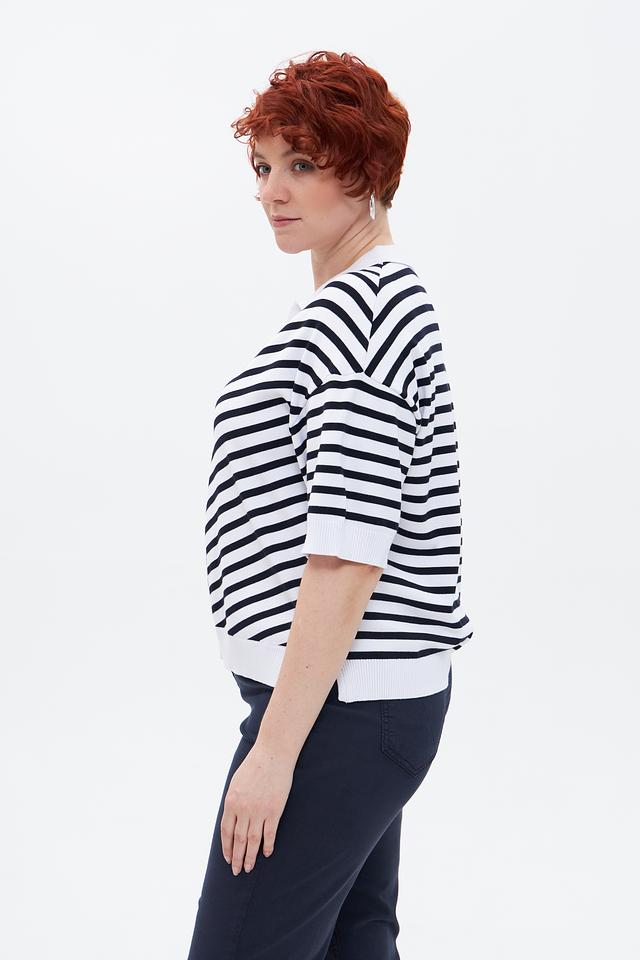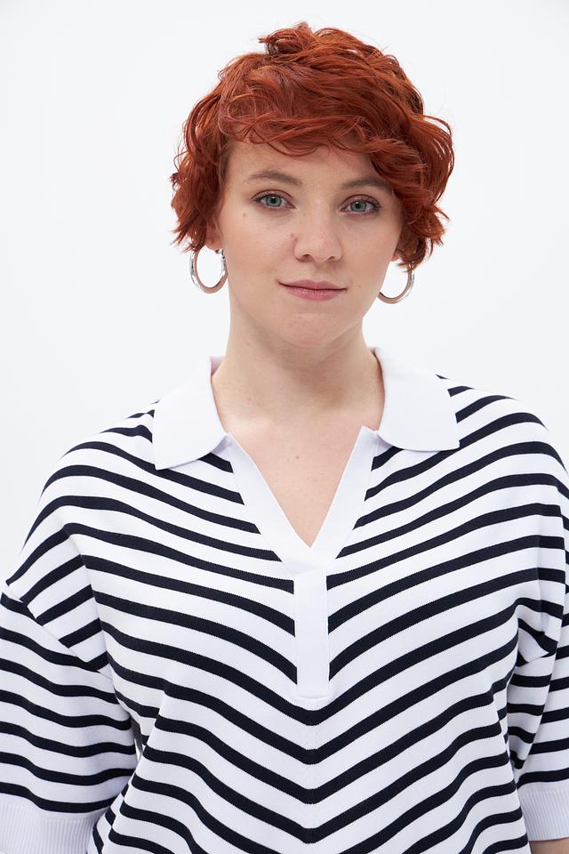 Стильный пуловер Tuzzi в бело-синюю полоску с коротким рукавом и воротником поло. Изготовлен из мягкой вискозы с добавлением полиэстера для удобства в носке и поддержания формы. Состав: вискоза 72%, полиэстер 28%