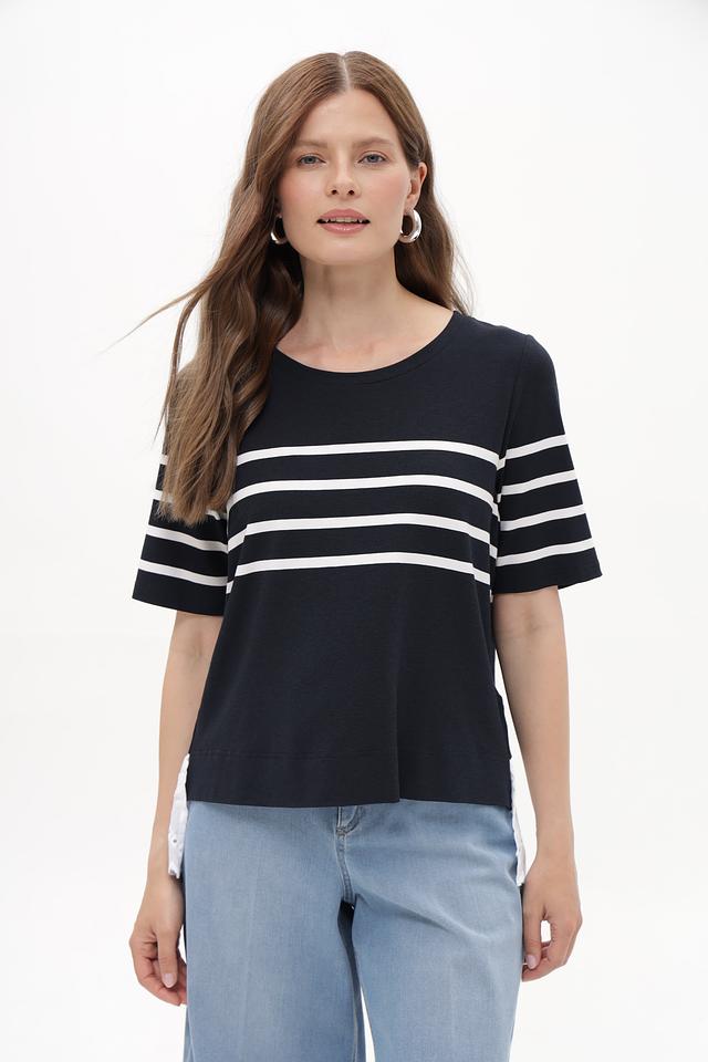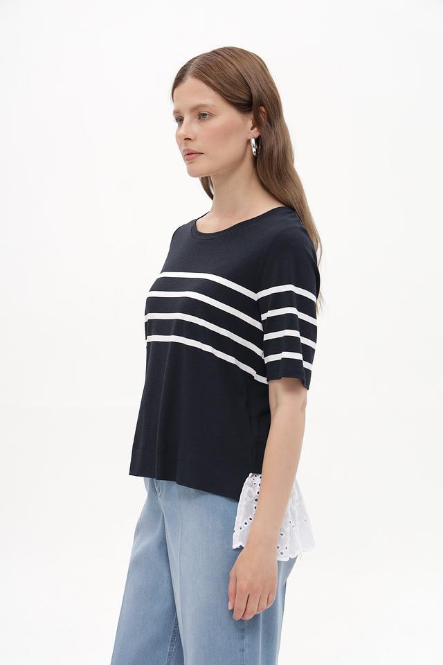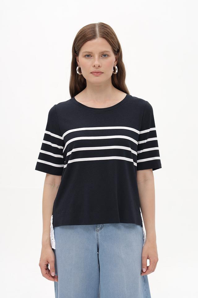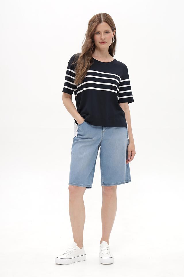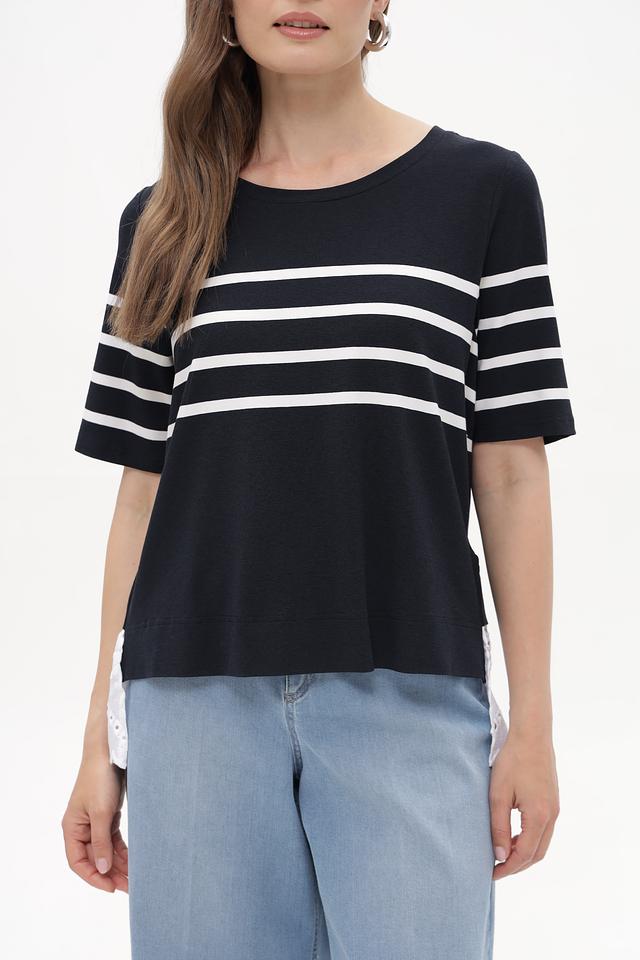 Женская футболка Tuzzi синего цвета с горизонтальными белыми полосами и кружевной вставкой. Модель выполнена из мягкой вискозы с добавлением эластана, обеспечивающей комфорт в носке. Состав: вискоза 96%, эластан 4%