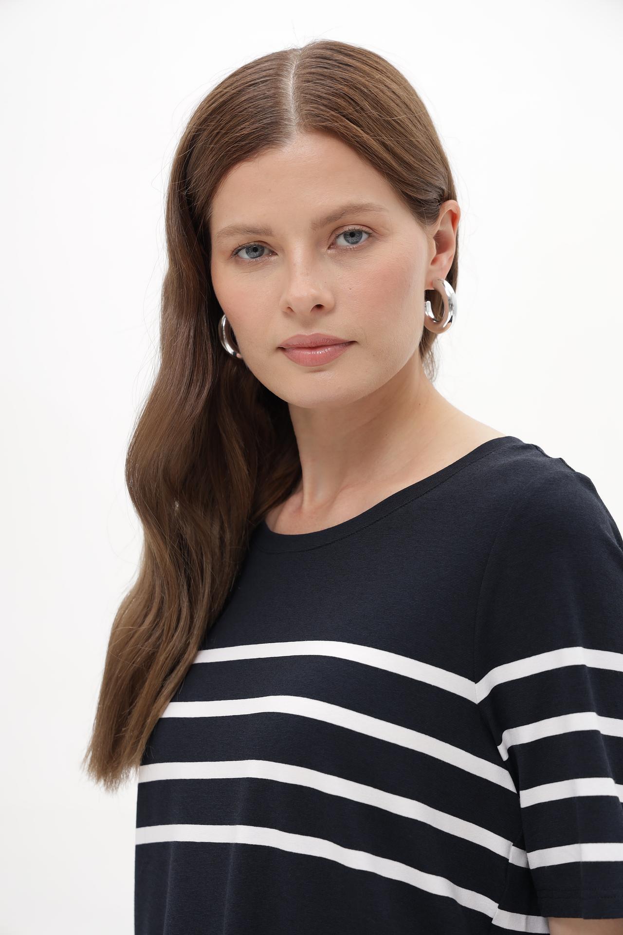 Эта стильная футболка Tuzzi станет прекрасным дополнением к вашему гардеробу. Сочетание элегантного дизайна и комфортного материала делает её идеальным выбором для повседневной носки. Благодаря высокому содержанию вискозы в составе (96%) футболка приятна к телу, хорошо пропускает воздух и обеспечивает ощущение свежести в течение всего дня. Добавление эластана (4%) гарантирует отличную посадку по фигуре и свободу движений. Футболка женская, футболка в полоску, футболка с кружевом.