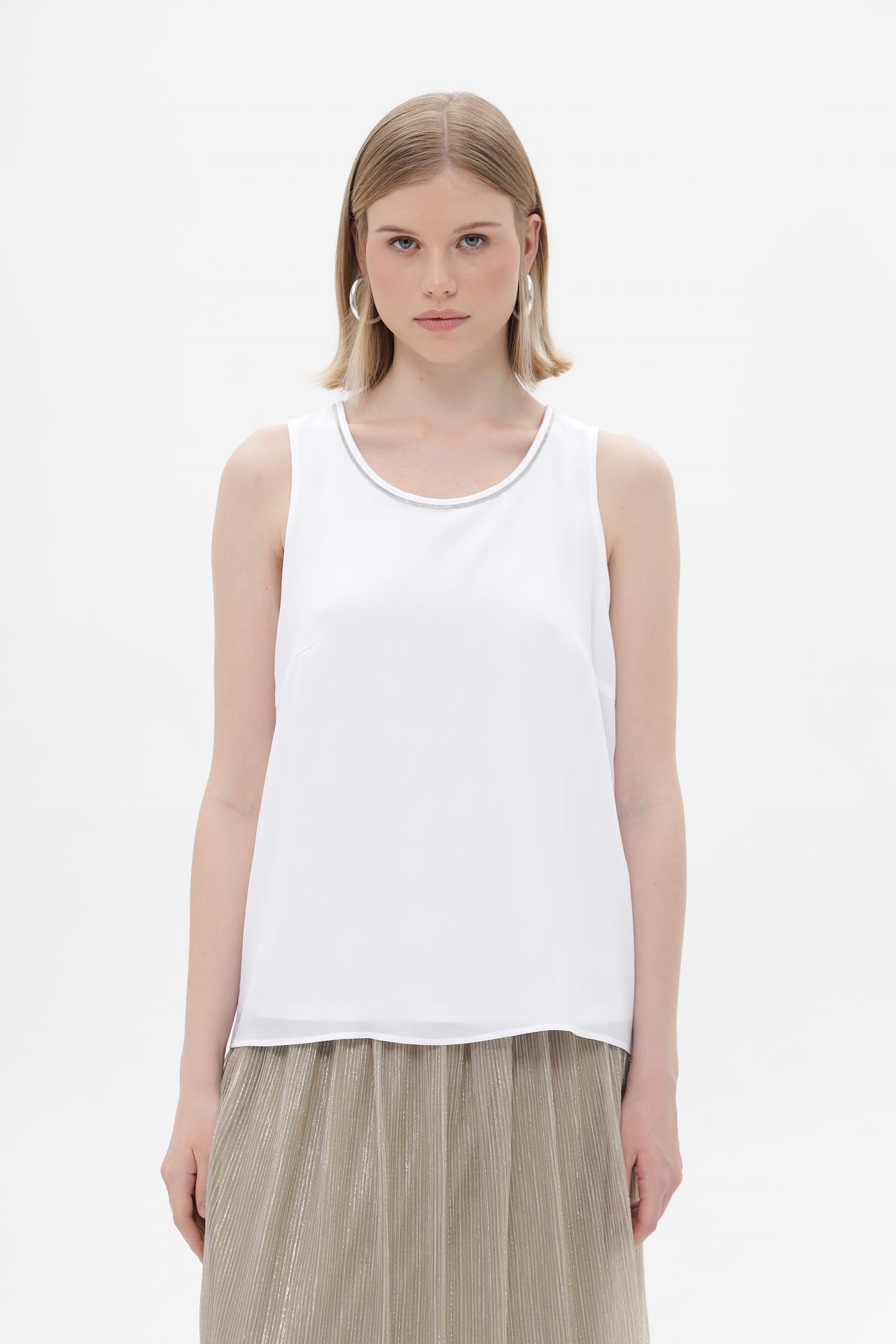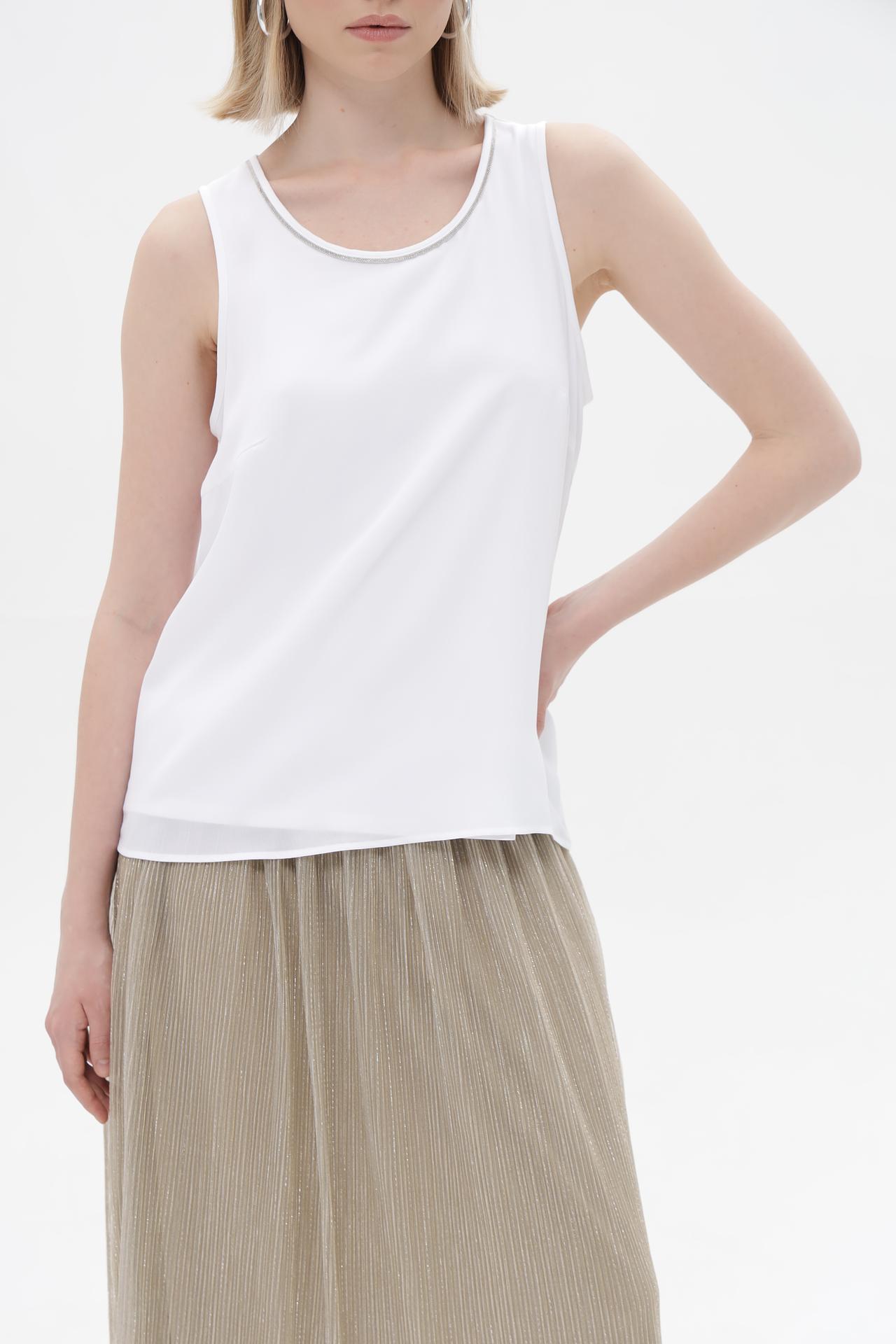 - Декоративная отделка: Элегантная отделка горловины придает изюминку и делает топ более нарядным.