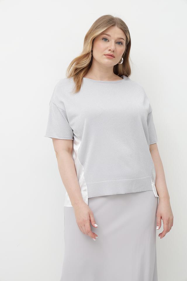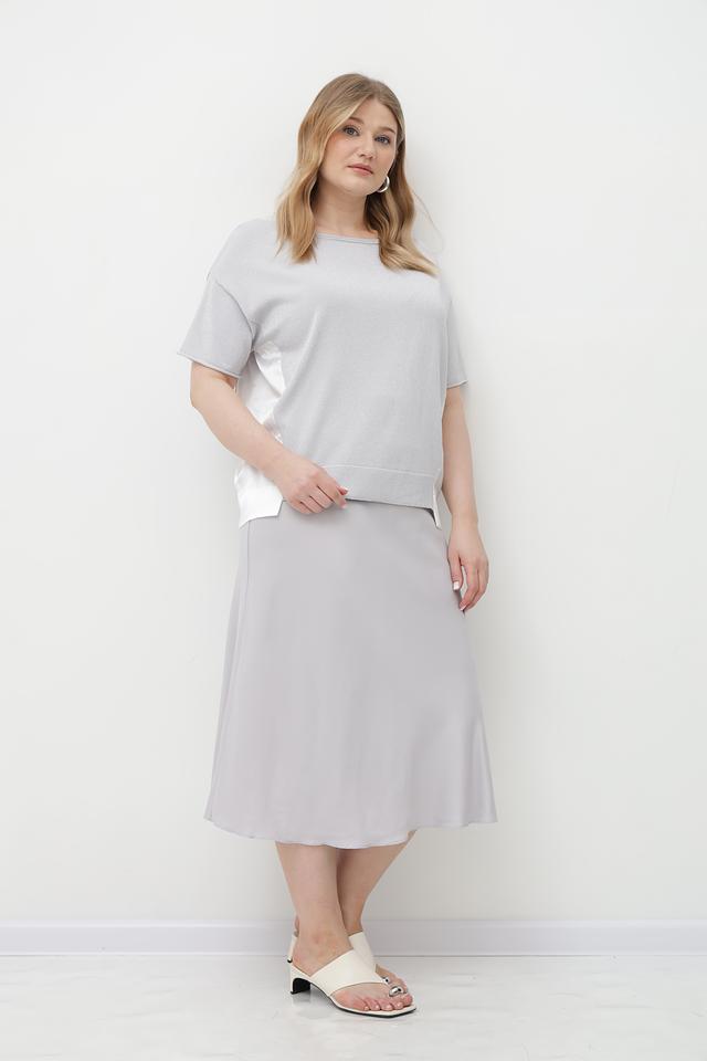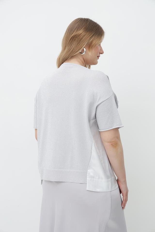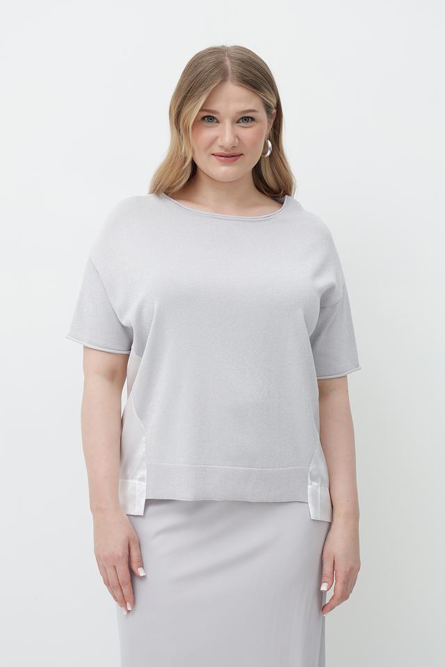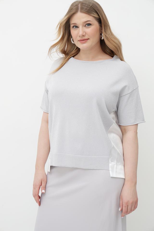 Модель имеет прямой крой, короткие рукава и круглый вырез горловины. По бокам пуловер украшен контрастной светлой лентой, которая добавляет образу изысканности и оригинальности.