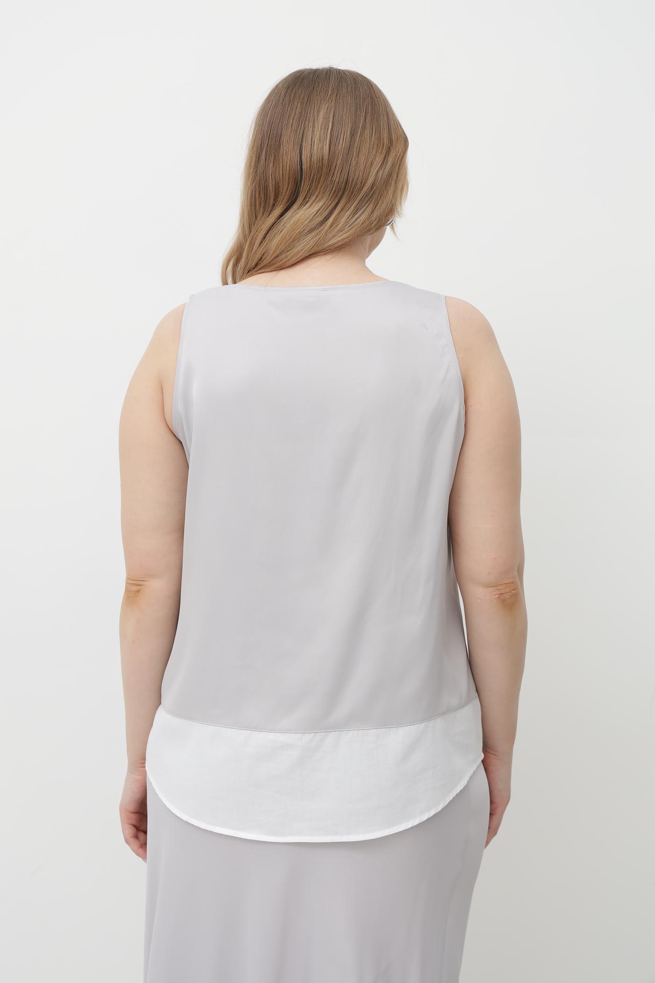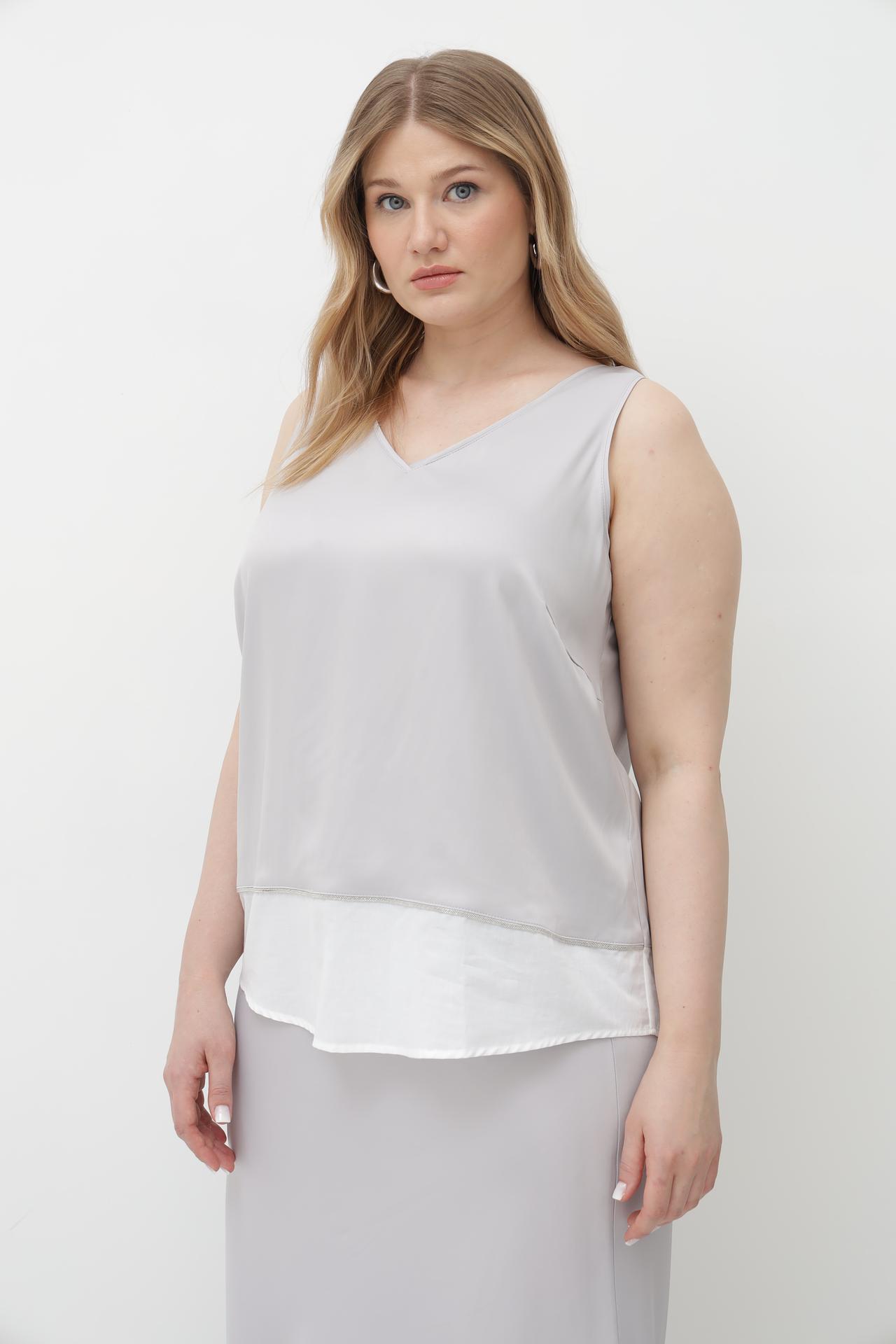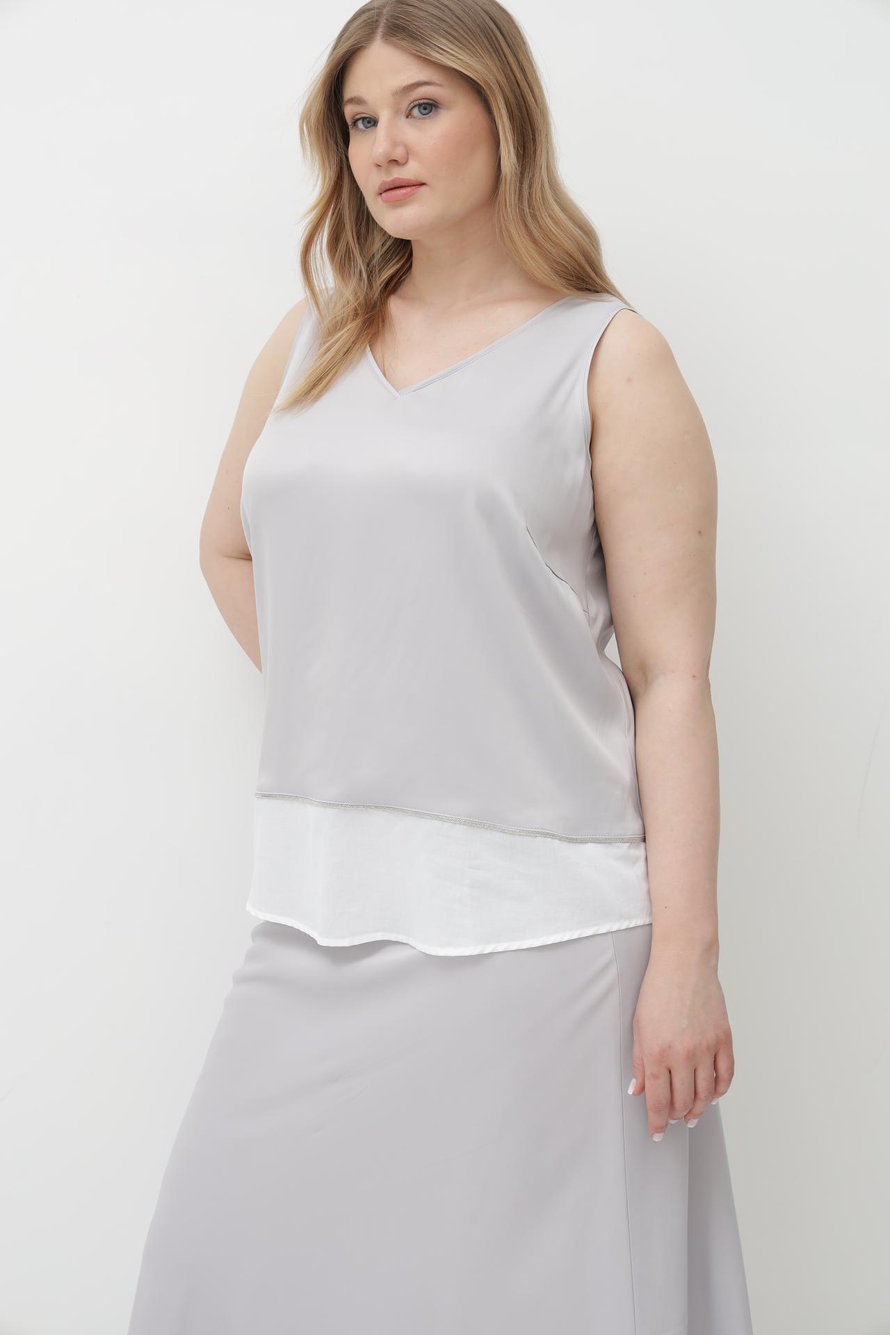 - Цветовая гамма: Нежный серебристый оттенок основного топа и контрастный белый нижний слой создают утонченное цветовое решение, которое легко сочетается с различными элементами гардероба.