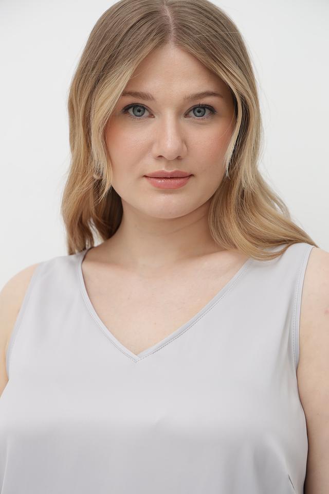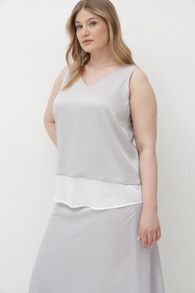 Серый топ Tuzzi из вискозы с V-образным вырезом и контрастным белым воротником. Изготовлен из мягкой и приятной к телу ткани, обеспечивающей комфорт в течение дня. Состав: 95% вискоза, 5% эластан. Состав: вискоза 95%, эластан 5%