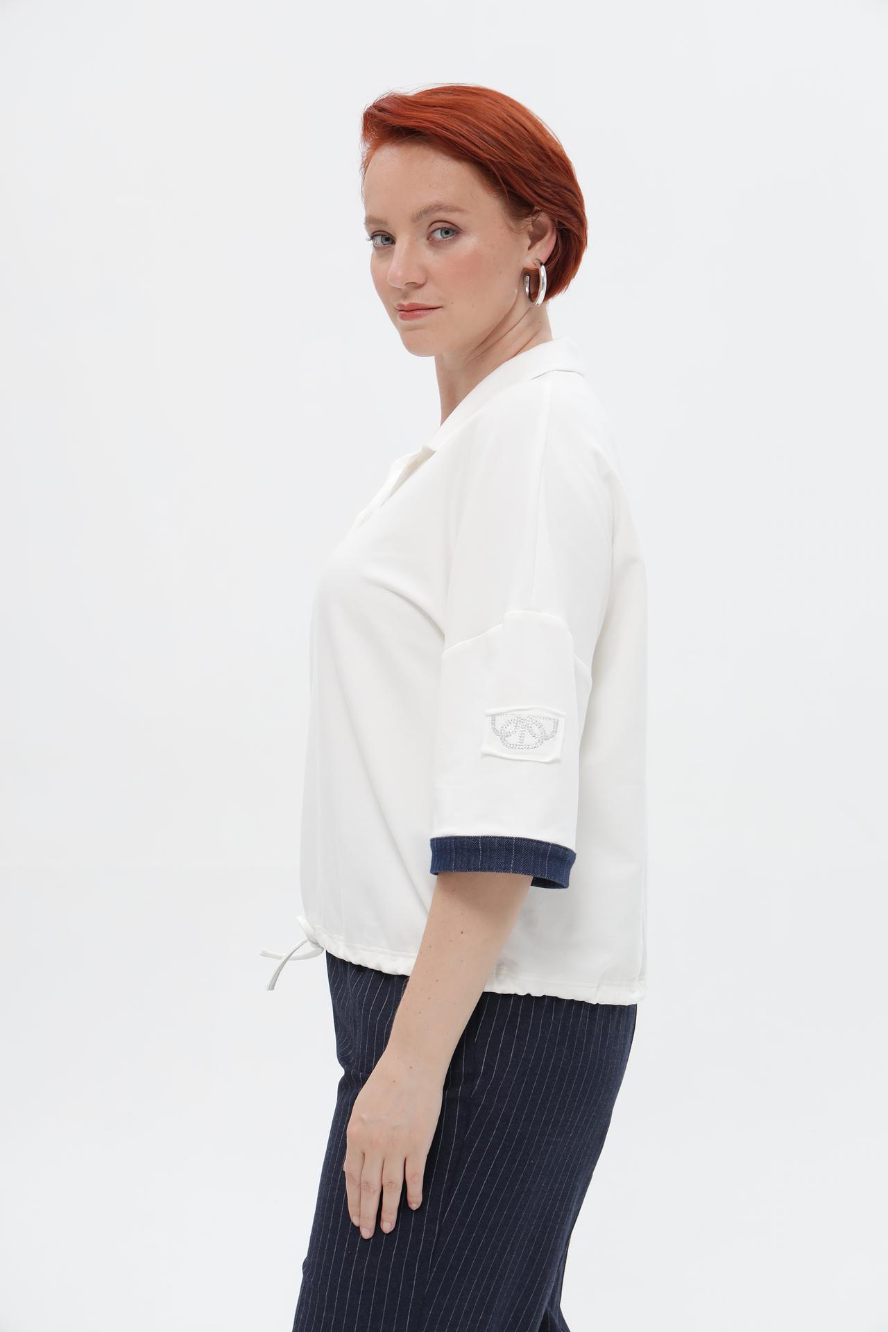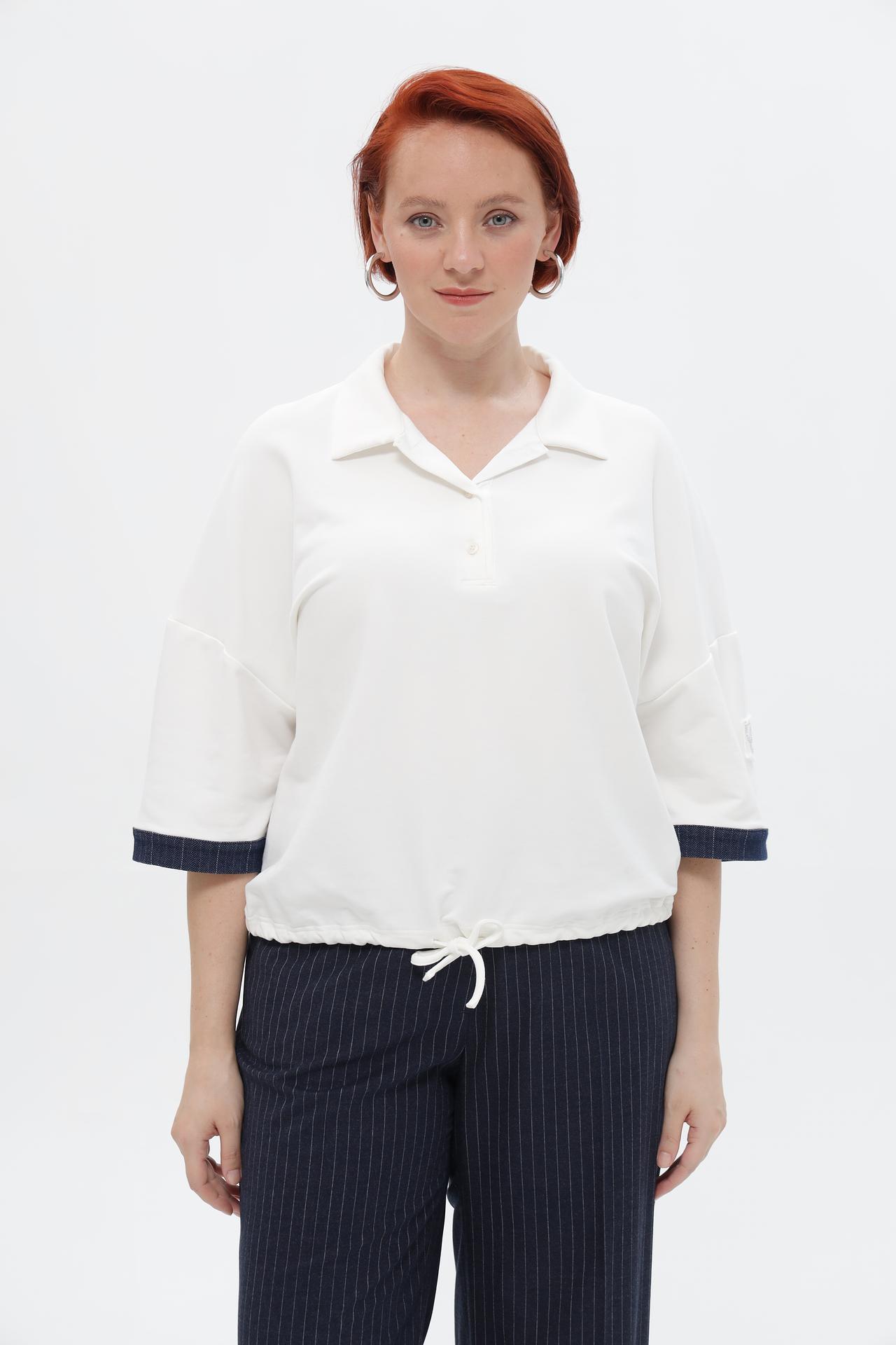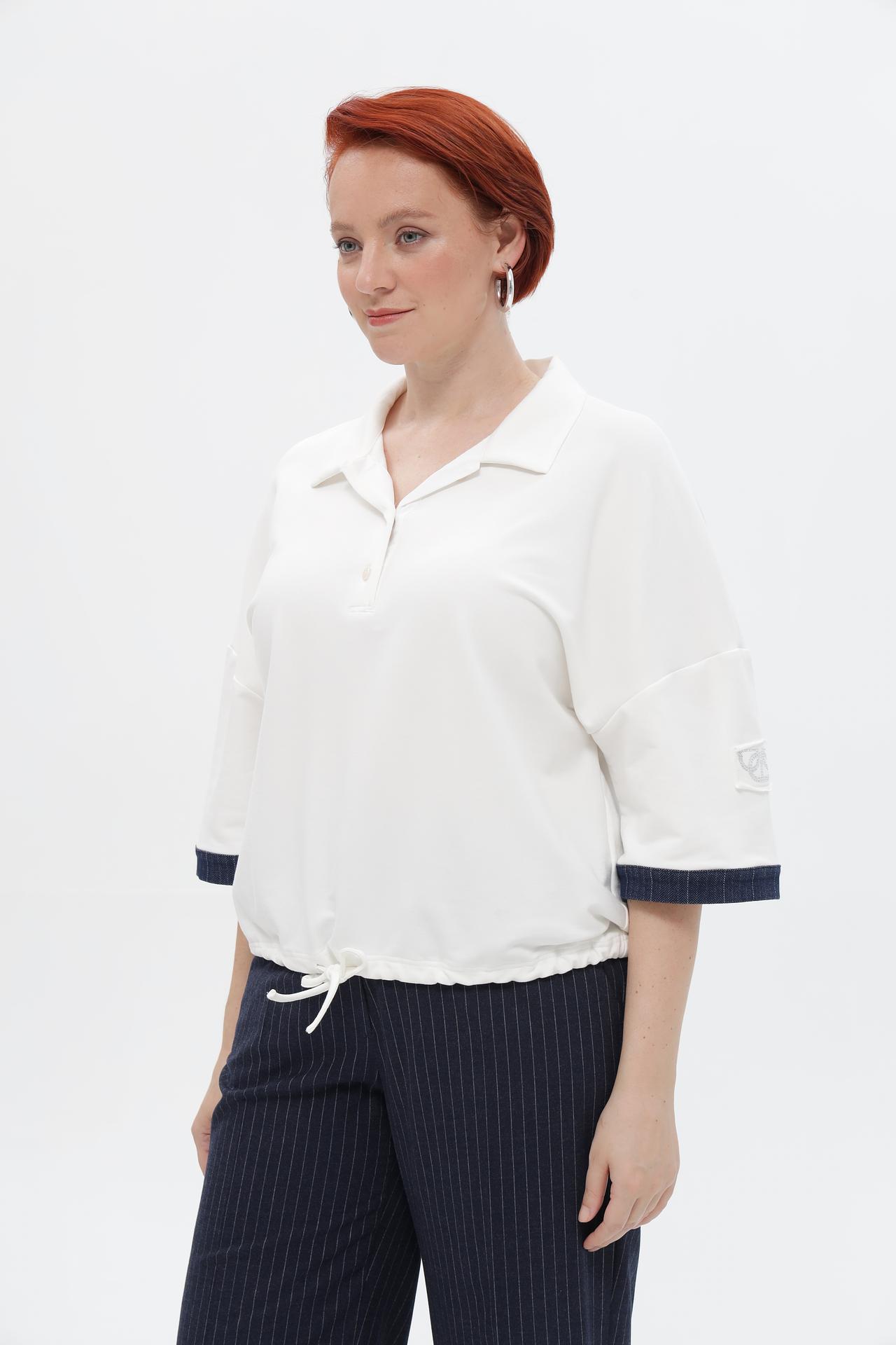 - Дизайн: Классический крой с воротником-поло и современной деталью в виде кулиски по низу. Универсальный белый цвет легко сочетается с различными предметами гардероба, а контрастные манжеты добавляют актуальности.
